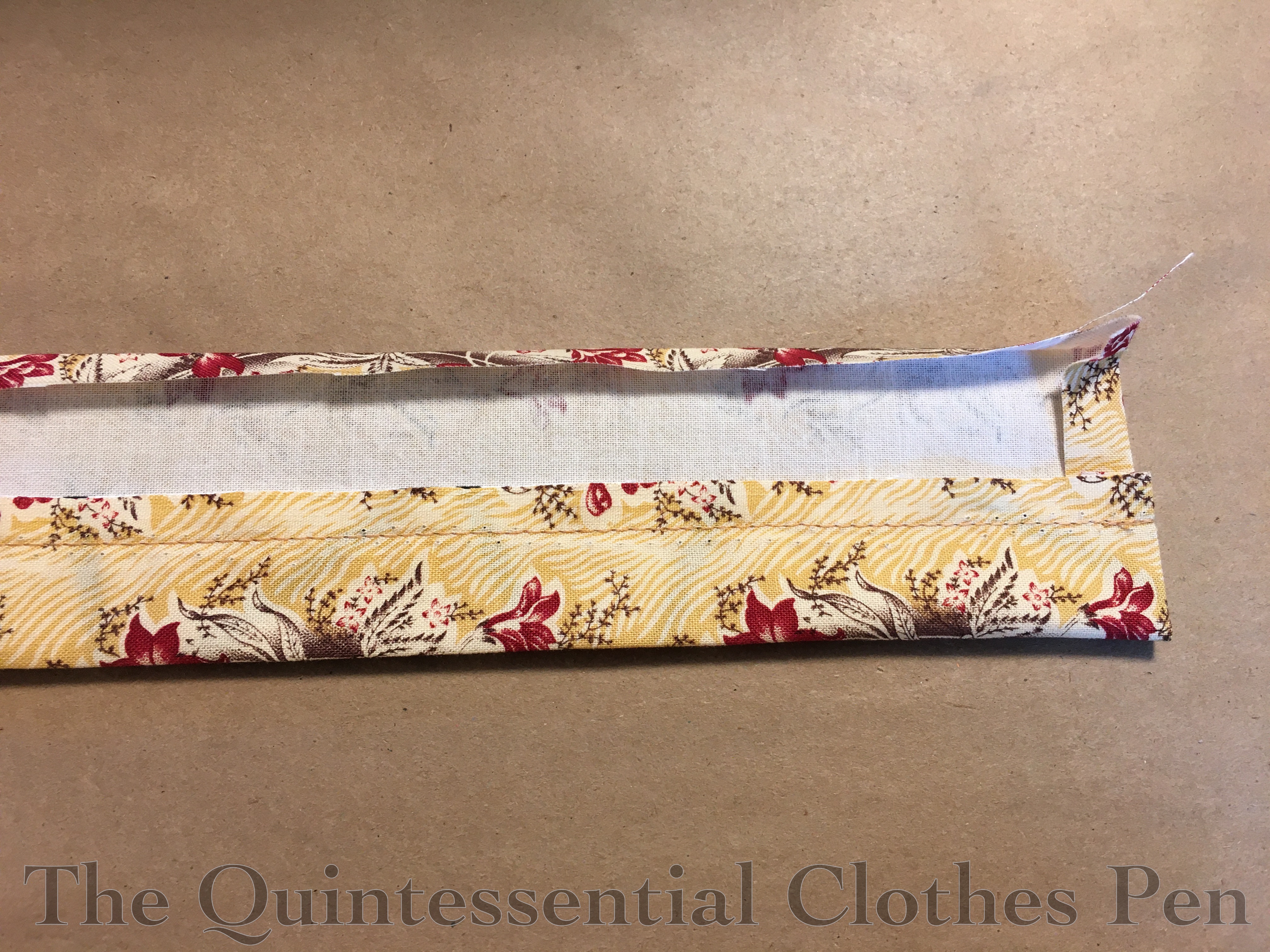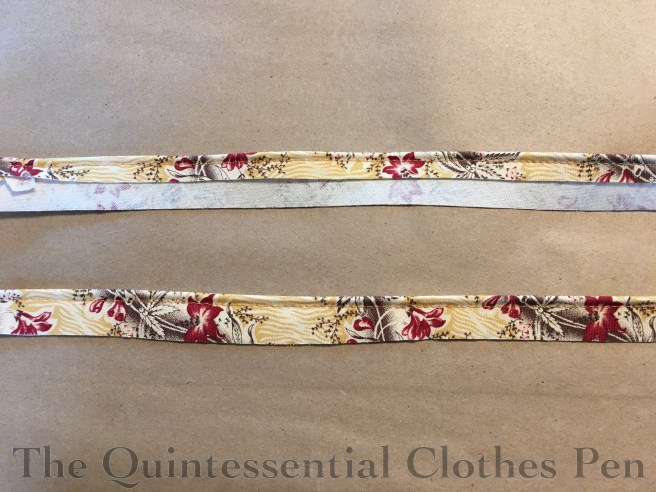 My cording is made up of bias scraps, some as small as about 4″ long, that are pieced together. The cording is machine stitched. I made it with even seam allowances for most of the seams, but thought ahead and offset the seam allowance for the neckline cording, to make it easier to turn it under and whip stitch later. The photo below shows the neckline cording (on the top) and regular seam cording (on the bottom).