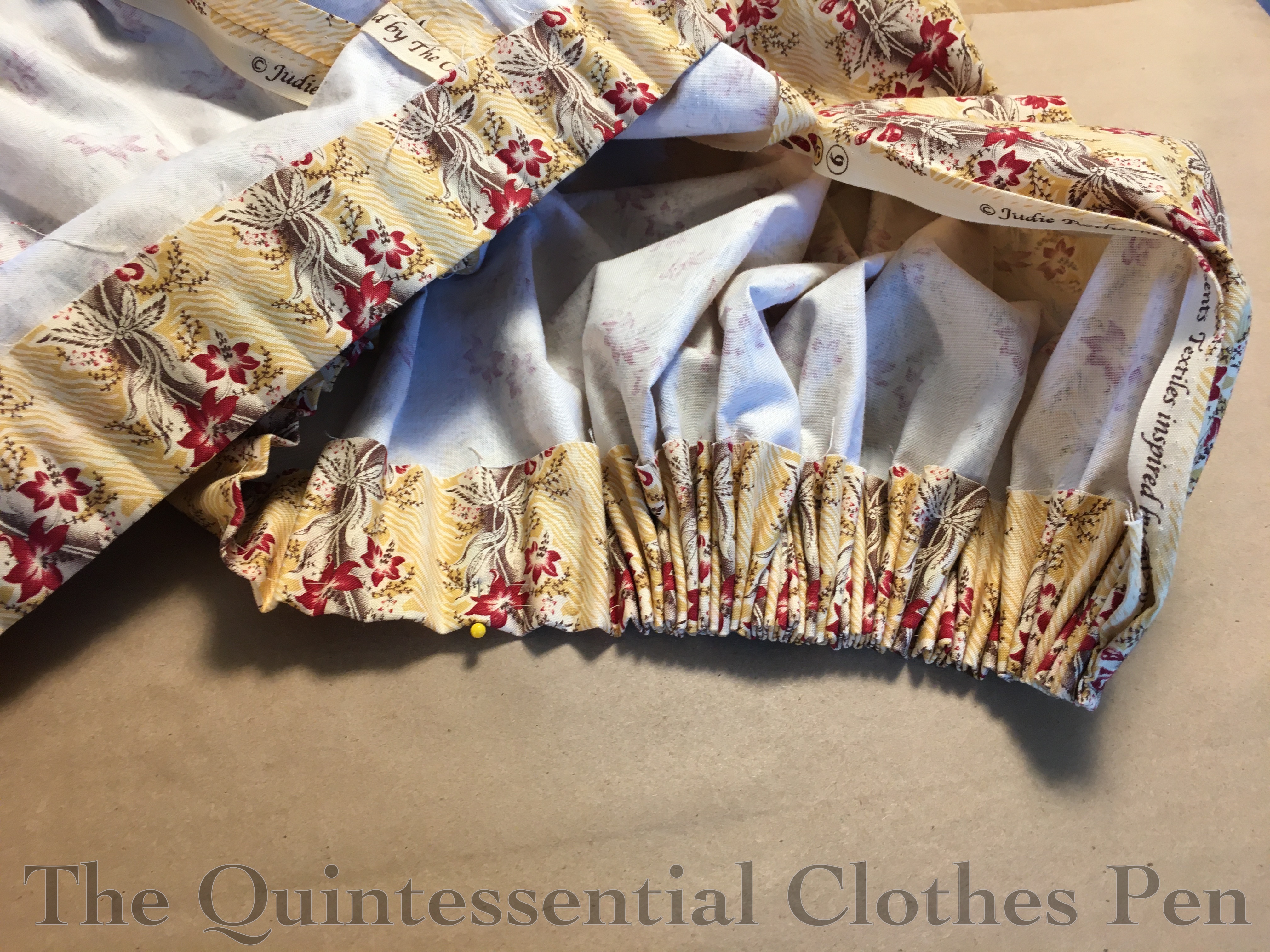 Here is the skirt in the process of being pleated. The top edge is left raw and folded over the flannel before I ran two rows of parallel stitches to form the pleats.