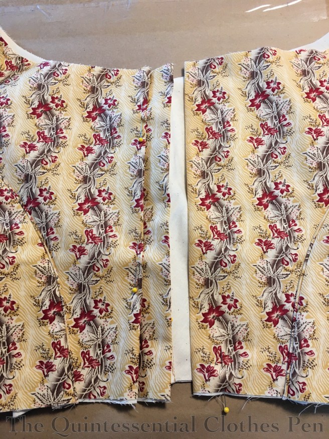 And here is one side back sewn to its corresponding back, with the cording in the seam. Even across these pieces my pattern matching is pretty good, especially at the bottom!