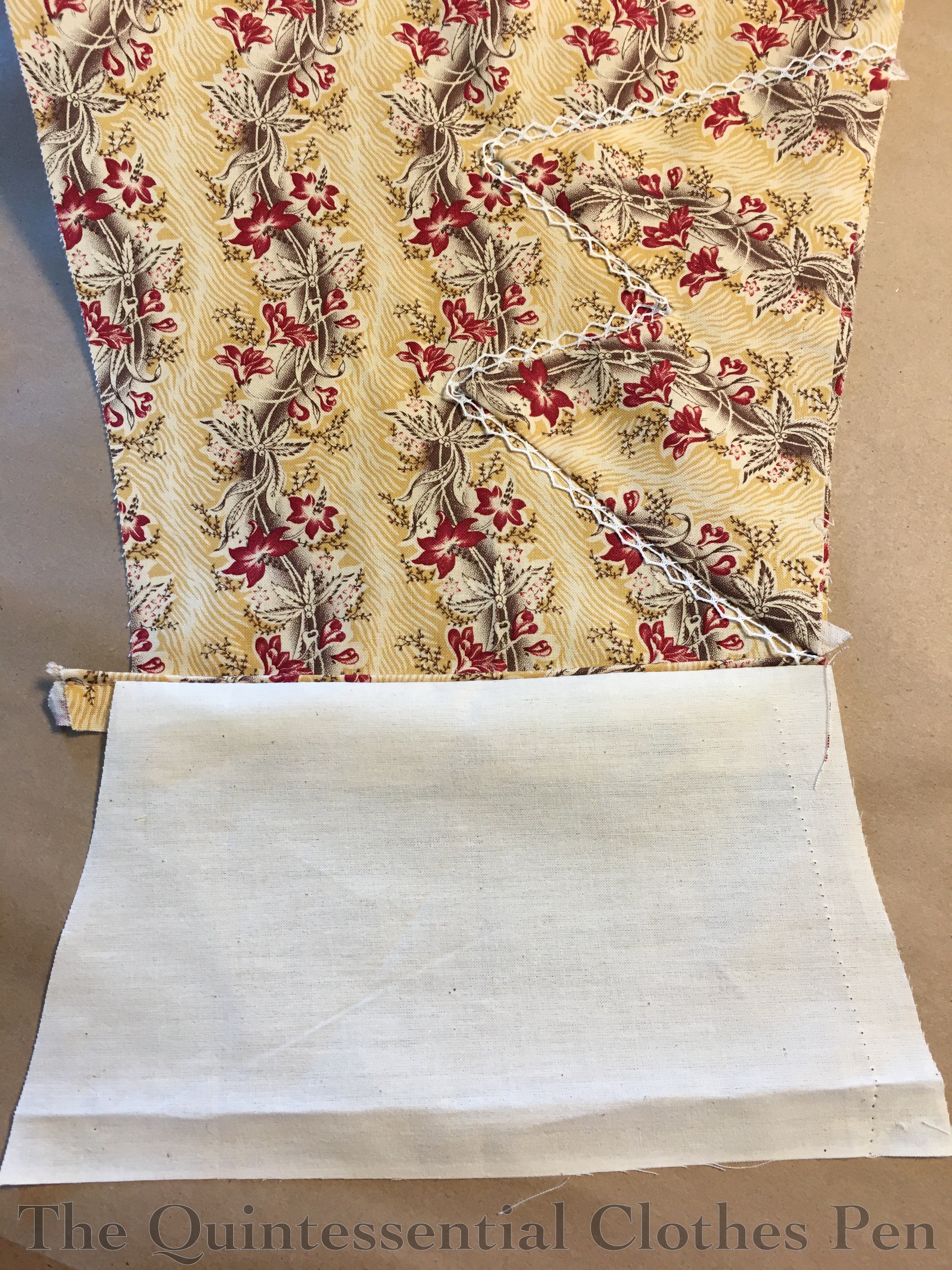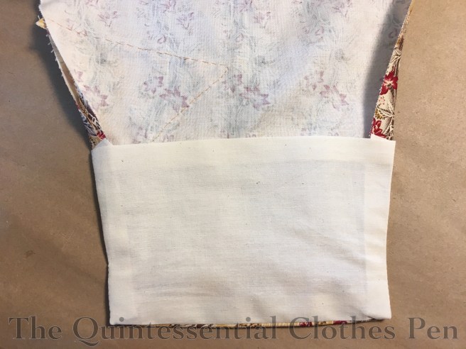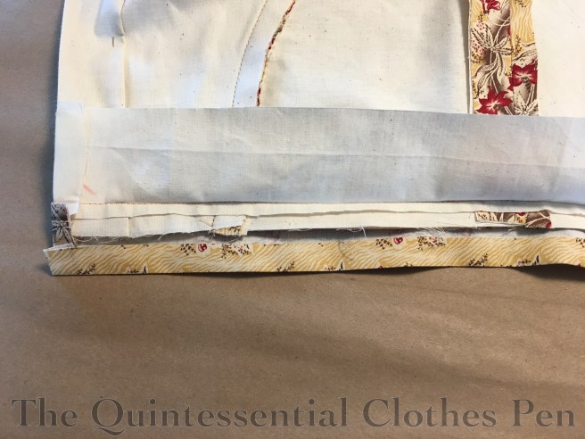 The outer waistband and inner muslin facing encase the bottom seam allowance of the bodice. They are machine stitched at the top, have graded seam allowances, and then the muslin is whip stitched along the bottom.