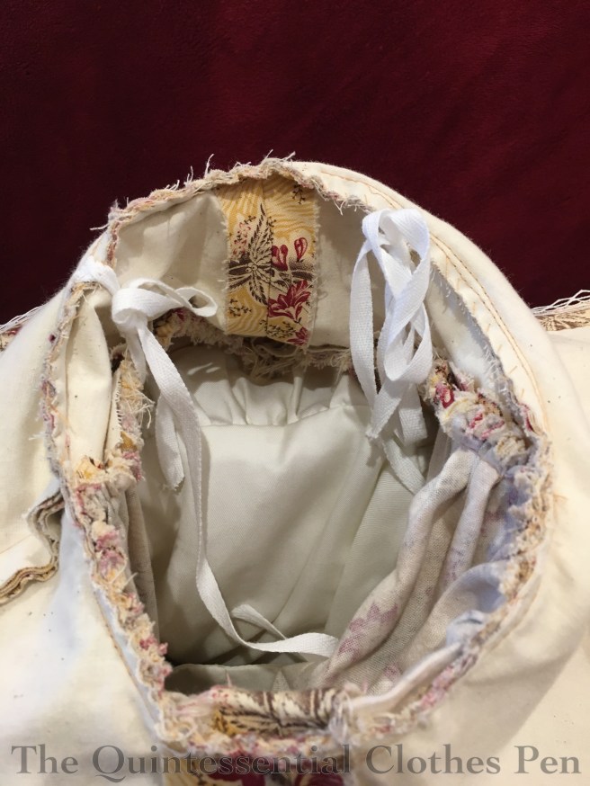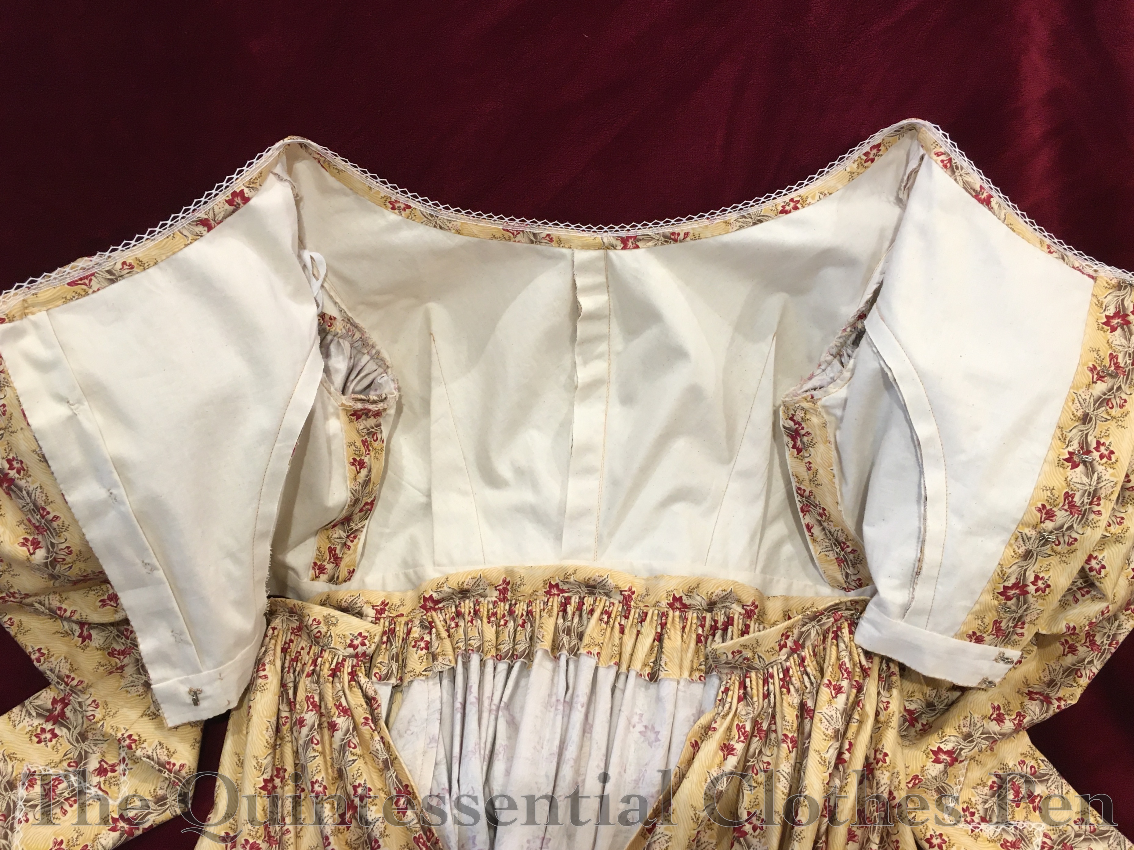 This is the inside of the bodice with the skirt attached. You can see machine stitching, seam allowances mostly left unfinished (they really don’t fray at all), neck binding, closures, etc.