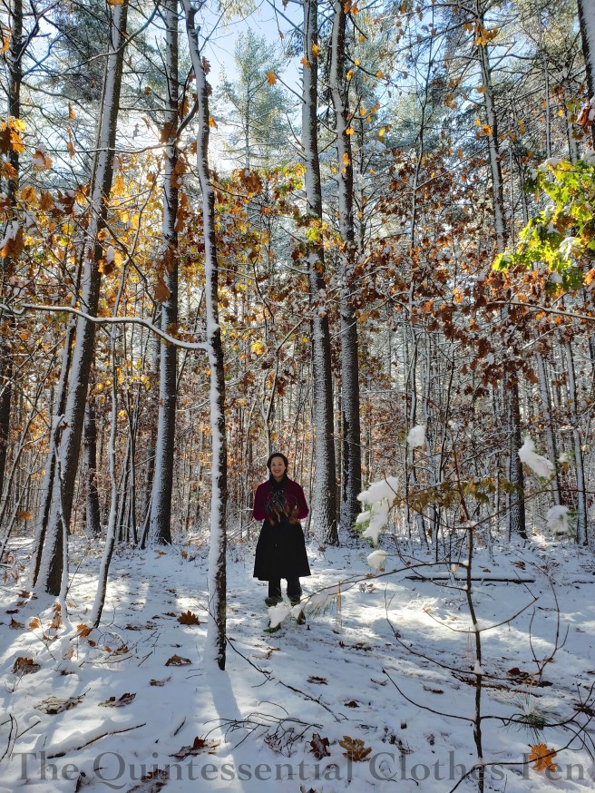 The last photo is from a magical snow we had on October 31. Weird, but I agree, so pretty and magical! It’s a sneak peak at more to come, because I was documenting the outfit on our walk through the woods. 🙂