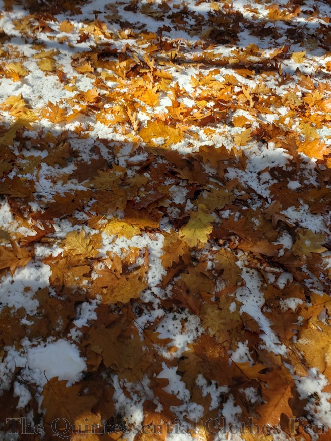 This snow was very early–occurring on October 30. Due to that early date, there was a beautiful mix of iconic golden bronze New England leaves still on the trees as well as on the ground, mixed with the snow.