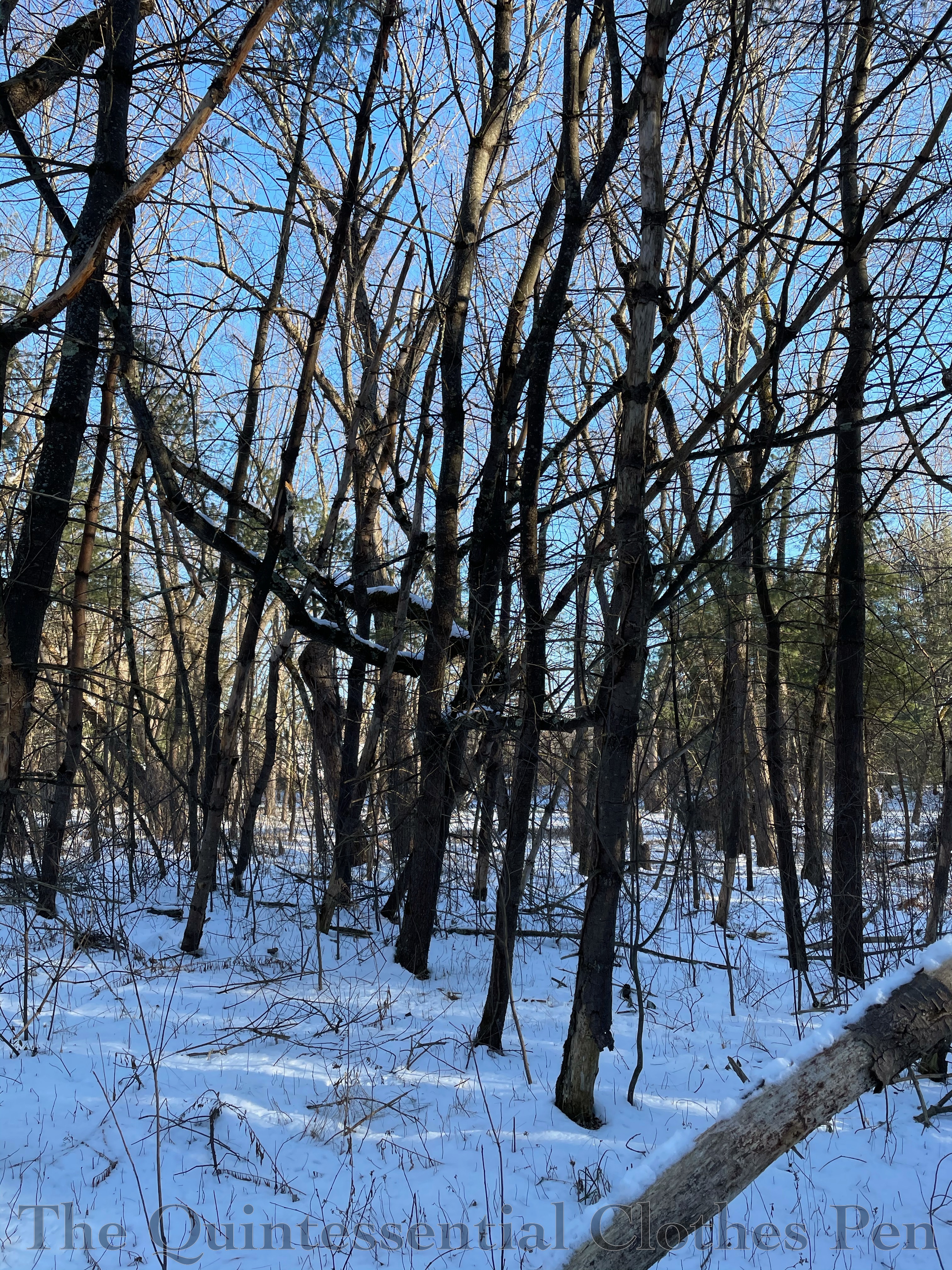 After crossing the fields, we arrived in the woods along the river. The bare trees made wonderful views for musing as they stood in the snow.