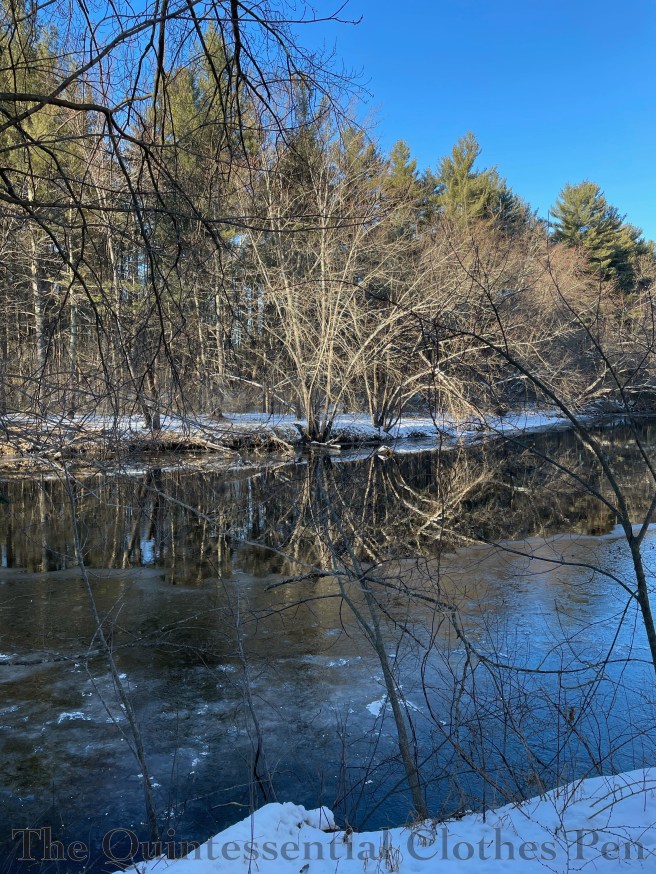 The river is large enough to not freeze over entirely, though the shallow edges were covered with ice. I appreciated the bands of interest provided in this view. Snow, bare shrubs, ice, wonderfully reflective water, grey trees, green pines, and very blue sky.