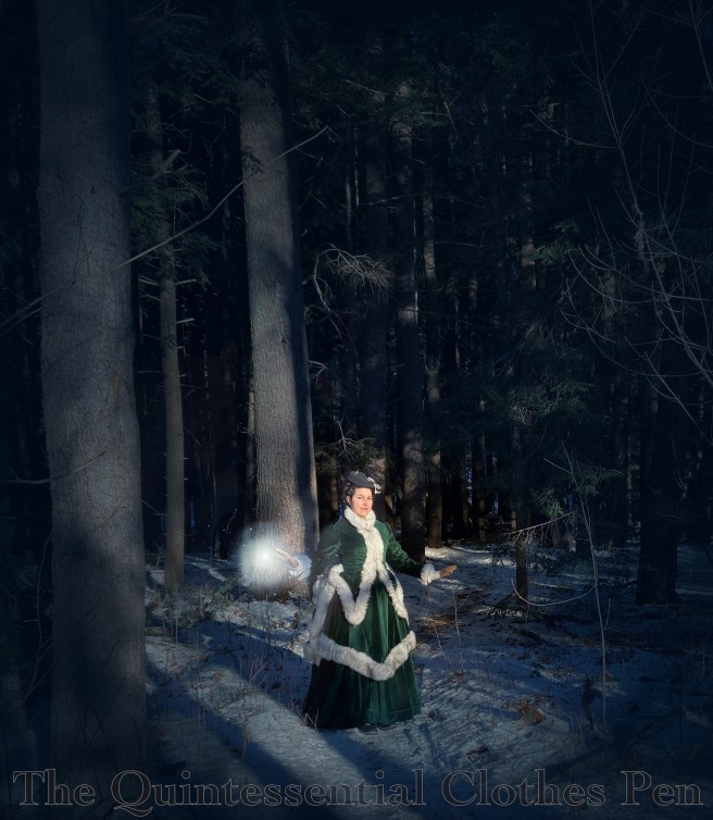 Long before winter had arrived, I had a vision for getting atmospheric winter woodland photos of my recently posted about 1884 Wool Plaid Dress and 1885 Wool Mantle. (The links are to previous posts about these garments that have tons of inspiration, patterning, construction, and finishing details–check them out if you want to see more details up close or learn about how these garments were made.) I was joined in my plans by a friend (who blogs at Plaid Petticoats) who also had a winter-y bustle dress that, like my ensemble, needed to be appropriately documented and photographed. In this post, I’d like to take you with us on our photographic ramble to show you some of the beautiful winter sights that didn’t make it into the detailed construction posts.