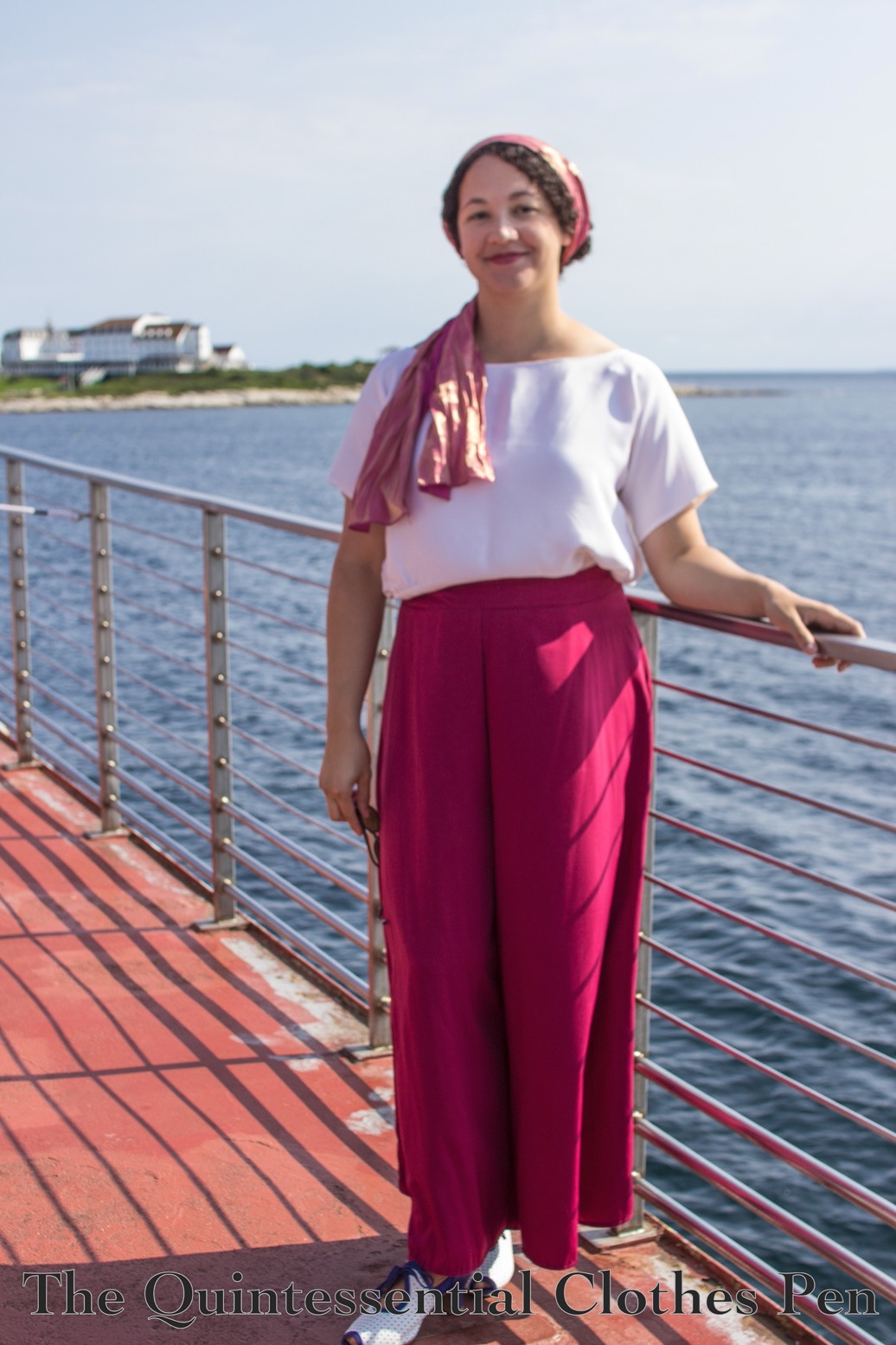 I’ve loved wearing my 1930s Beach Pajamas to this event over multiple years. They are super comfy and don’t show wrinkles (great for long car and boat rides!). I opted for them again this year but wanted to change them up to create a new outfit. After a look through my closet I decided to try wearing my 1922 silk blouse tucked into the pants for a new take on these old favorites.