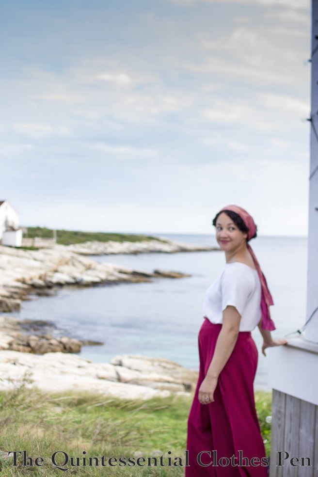 I added a decorative head scarf for a bit of a jaunty flair and finished off the bottom of the outfit with my American Duchess Ginger shoes. The scarf is one I’ve had for over 20 years. I used to wear it in the belt loops of my jeans as a decorative belt, I think… I haven’t used it for anything in probably 10 years or so, but I held on to it, thinking that the dusty pink color and gold sheen would be useful for something someday… and it was! I like how it blends the bold color of the pants with the bright white of the blouse.