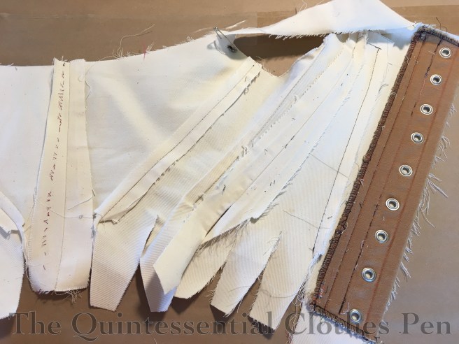 After finishing the stays, I was curious to see how the mockup would fit if I compared it to the finished stays. It turns out that I basically had to add in the width I’d taken out in the mockup when I added my back gusset. Sigh!