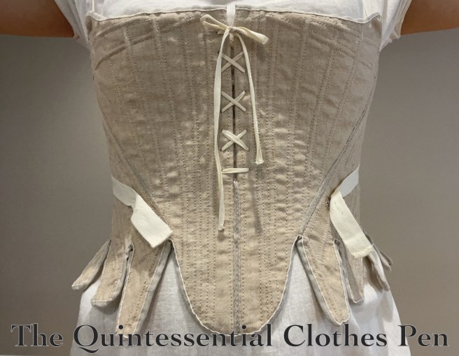 I held off sharing about them for quite awhile because I wanted to finish the saga of these stays… but eventually I gave up, and at the end of 2022 had great fun sharing the success and construction of my c. 1785 Green Linen Stays.