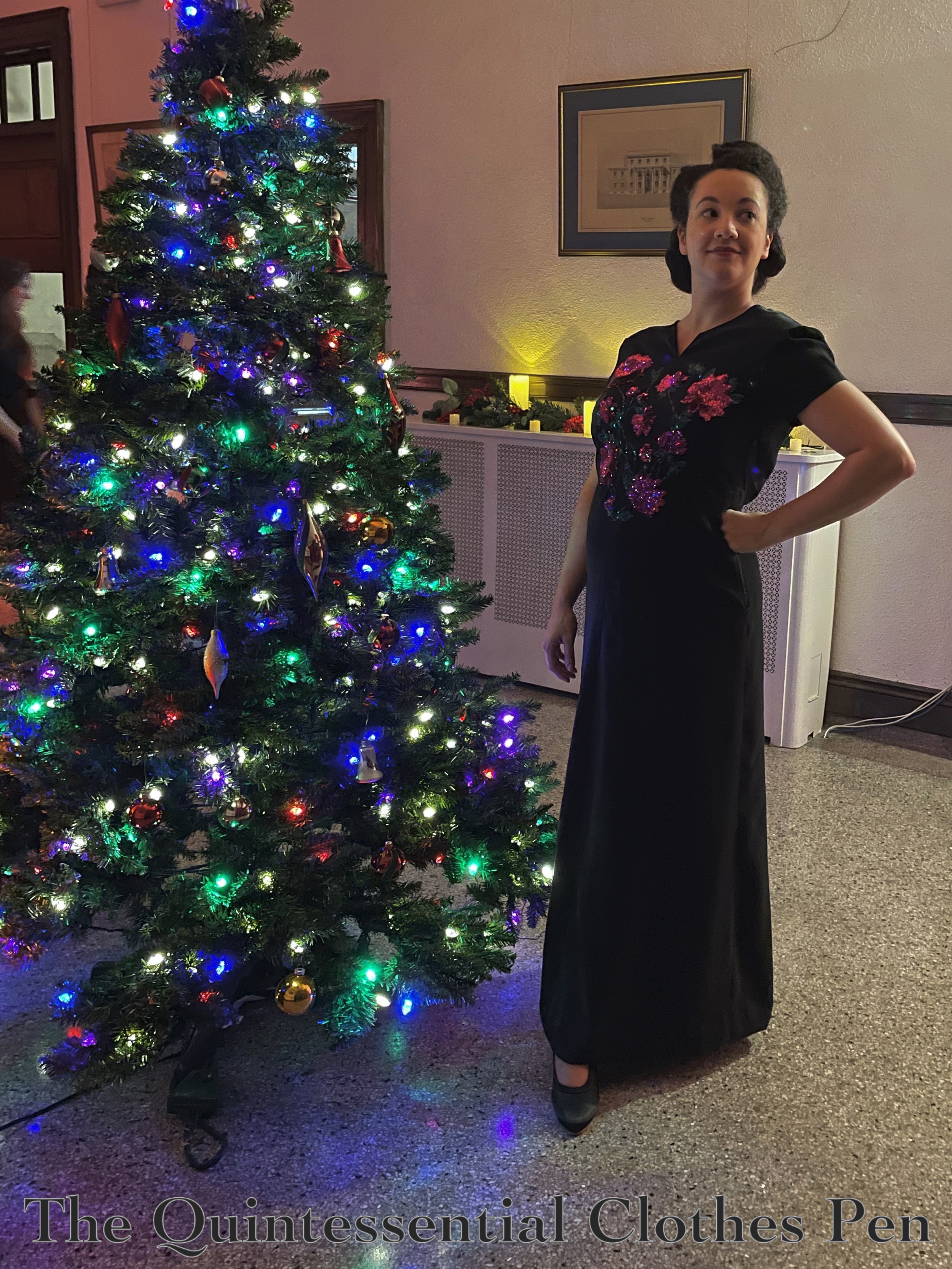 I’m very pleased with my finished 1940 Schiaparelli Inspired Dress! The relatively simple style is set off by the pink and green sequined appliqué on the front of the dress.