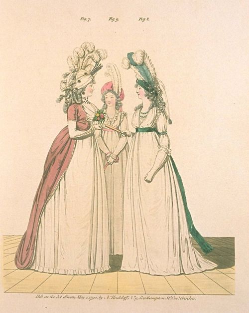In addition to the bodice shape, I was particularly inspired by the fashion plate below for the ruffles at the hem and wrists. Other fashion plates from this year show the same detail. The plate below, and more from 1794, can be seen on the Dames a la Mode website here.