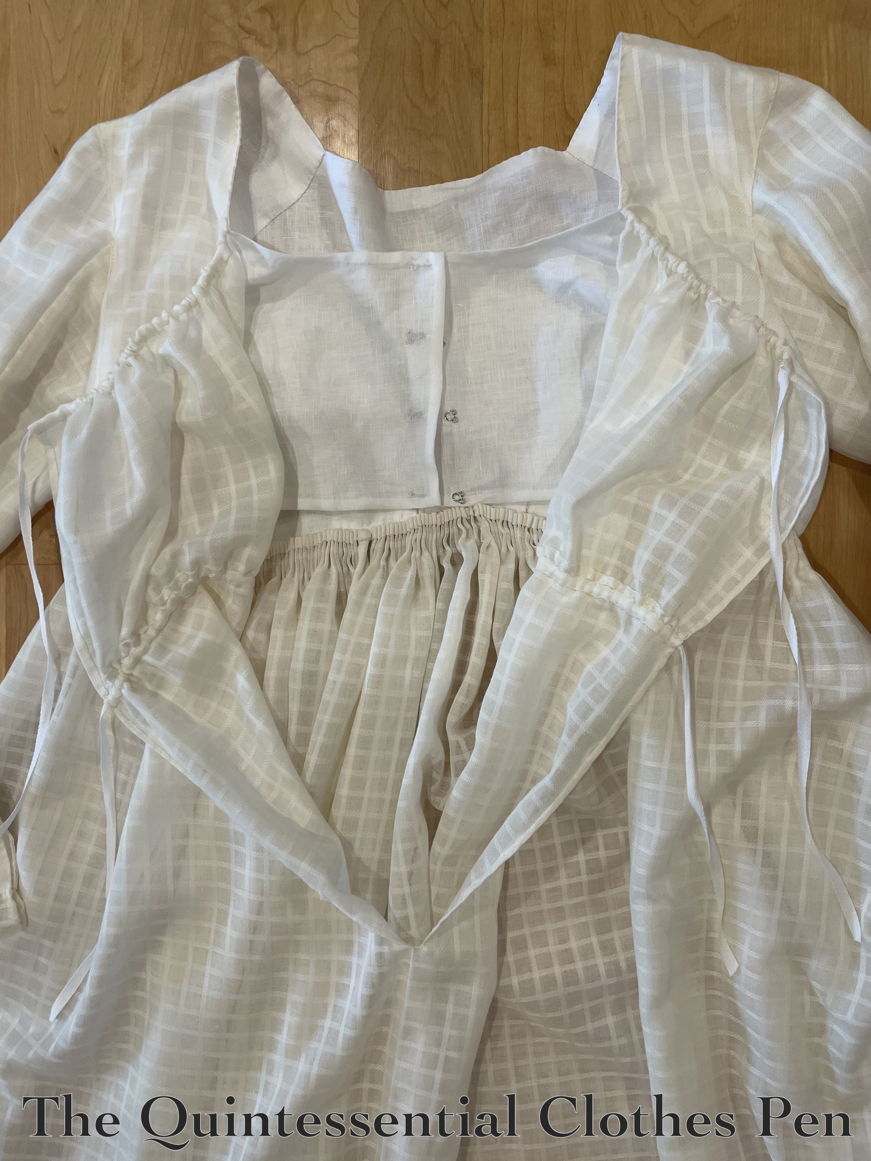 The next photo shows the back of the bodice, which curves up a little at center back in a very 1790s way, as well as the very full skirt that is attached across the back using cartridge pleats, creating a lovely series of folds.