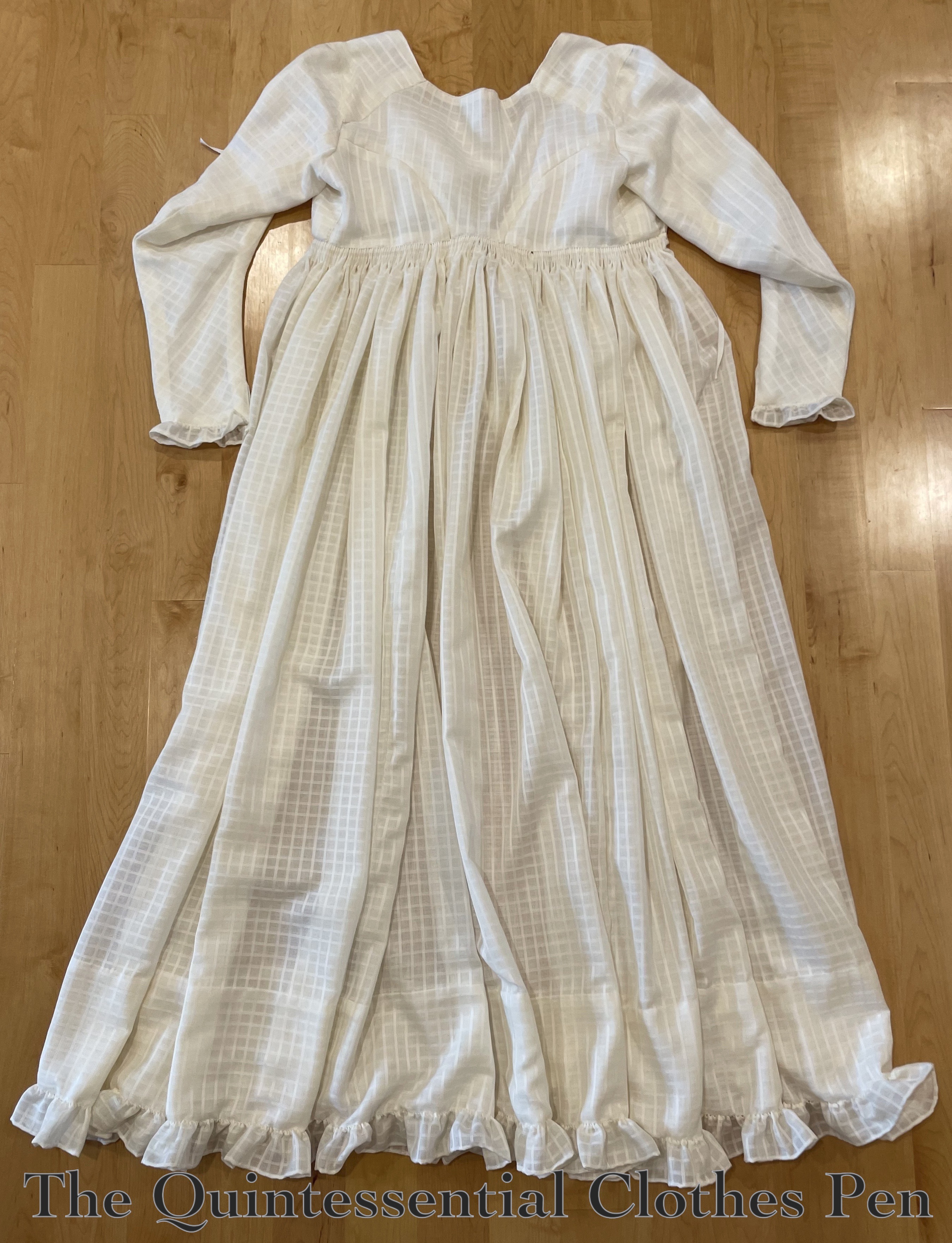 The reason for the unusually (for this period) deep hem is that my petticoat somehow ended up being a bit short, even with a narrow hem. I didn’t want to have the nice, smooth white expanse of this skirt broken by a section at the hem that wasn’t backed by a petticoat before the dense white of the ruffle. And I had lots of length in my dress exterior to play with.