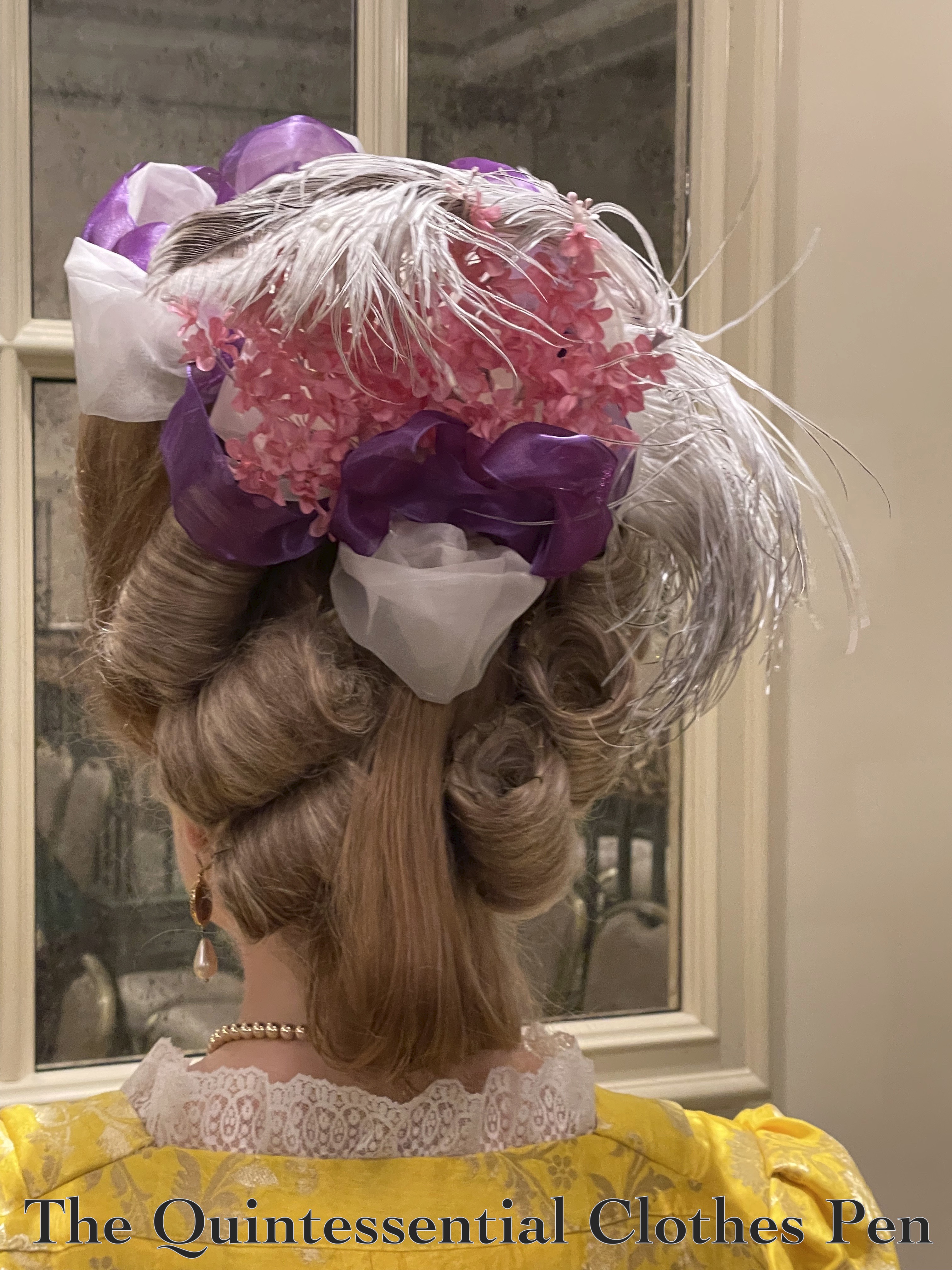 My friend wearing the Yellow Sacque also had a fabulously large hairstyle! Her style uses elements from the book The American Duchess Guide To 18th Century Beauty, including the ‘Ski Slope Hair Cushion’ and ‘1770s Pouf’ on pages 119 and 127. She also created her own buckles (those pre-made rolls of hair on the sides). And I had fun helping her place them the day of. It was fun to make two styles that are similar, but different in shape and details!