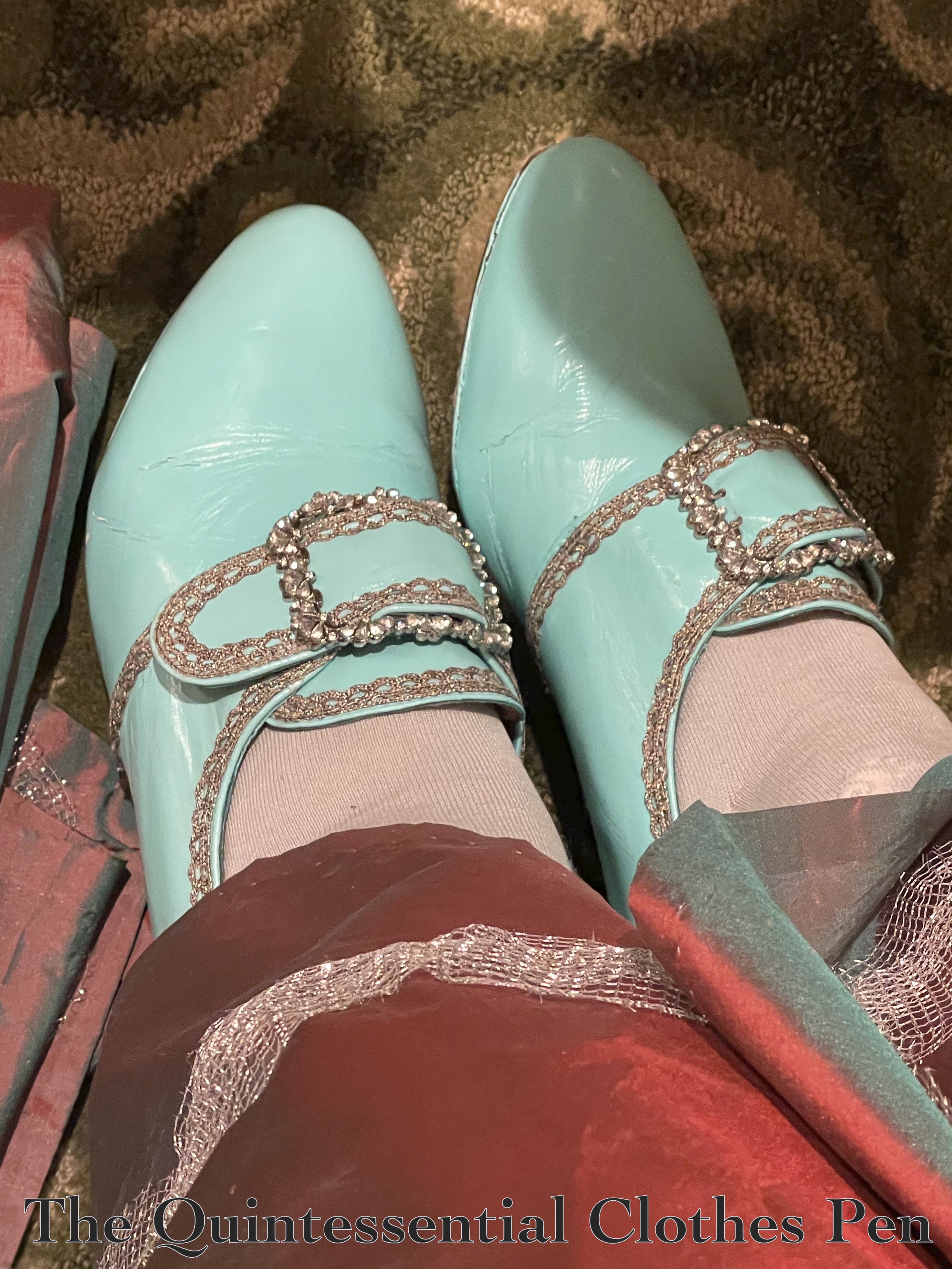 I was so pleased that my American Duchess Kensingtons were still in good shape after the immense amount of rain they endured in 2016. It was really exciting to break them out again with this dress! I’m still chuffed with the metallic lace I added. For Versailles, more bling was the thing! And in this photo, you can see how the light turquoise paint color picks up on the hints of turquoise in the dress fabric!