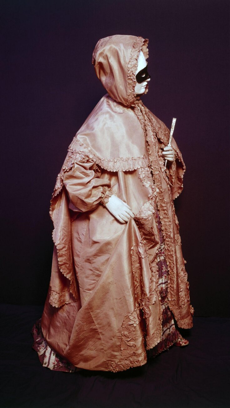 A domino is traditionally a voluminous black robe-like hooded cape worn with a black half mask as a disguise during Venetian Carnival. Dominos were popular during the 18th century at masquerades and it seems that hooded capes in this century were sometimes just generally called dominos (such as this one, perhaps, at the Metropolitan Museum of Art). By the 19th century, dominos were occasionally seen at masquerades, and even less often at fancy dress events (a costume party without masks).