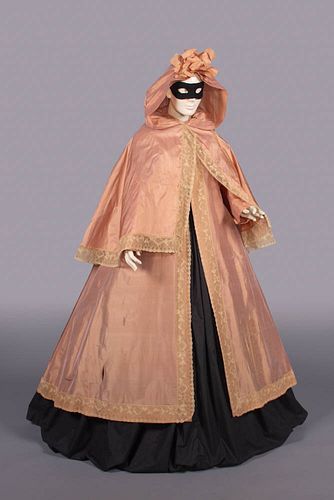 Below is another example, from the late 18th or early 19th century, also pink. This domino still shows evidence of 18th century construction styles — particularly the large gathered hood and what appear to be rectangle shaped sleeves. The extant example below is from Augusta Auctions. They labeled it as a Two Piece Shot Silk Domino, c.1800.