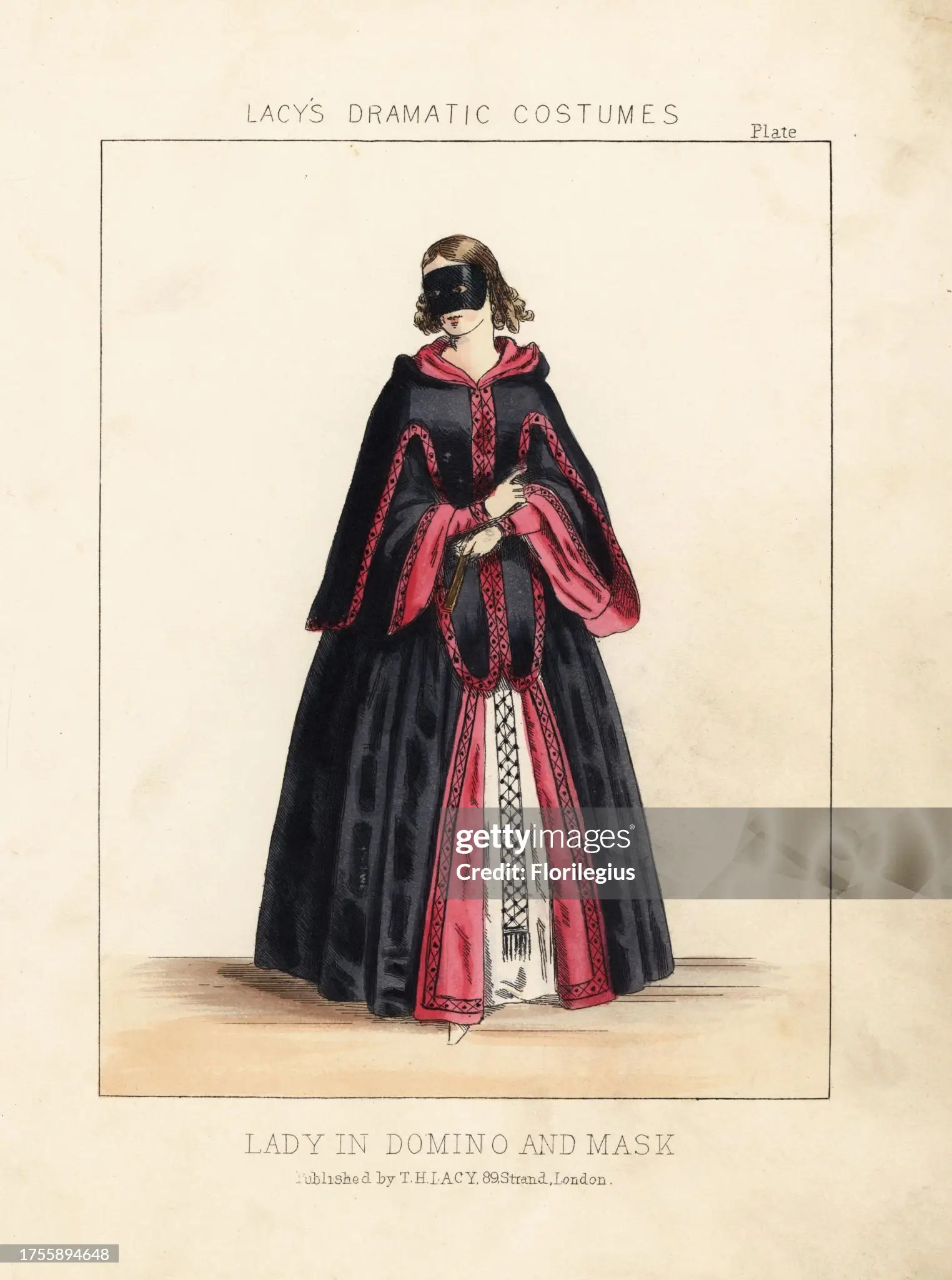 Below is an example of a mid-19th century take on a domino. This is a costume idea for a masked ball (or masquerade). This plate is from Thomas Hailes Lacy’s “Female Costumes Historical, National and Dramatic in 200 Plates,” London, 1865 (from Getty Images).