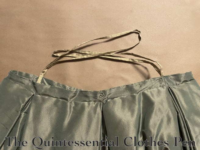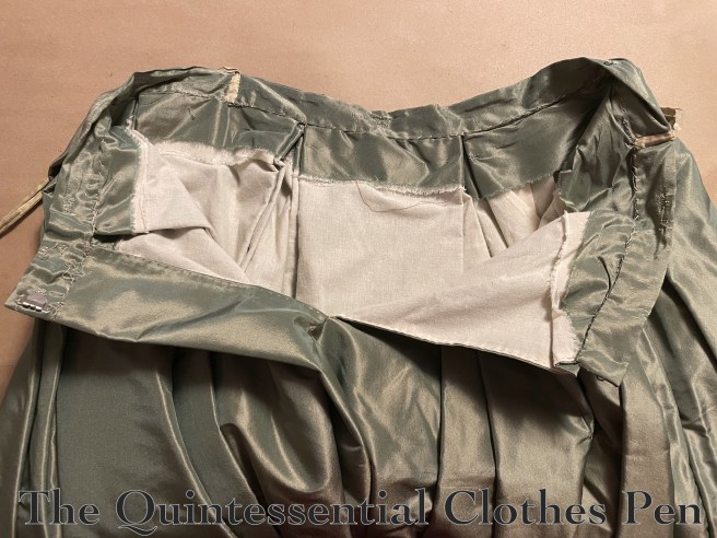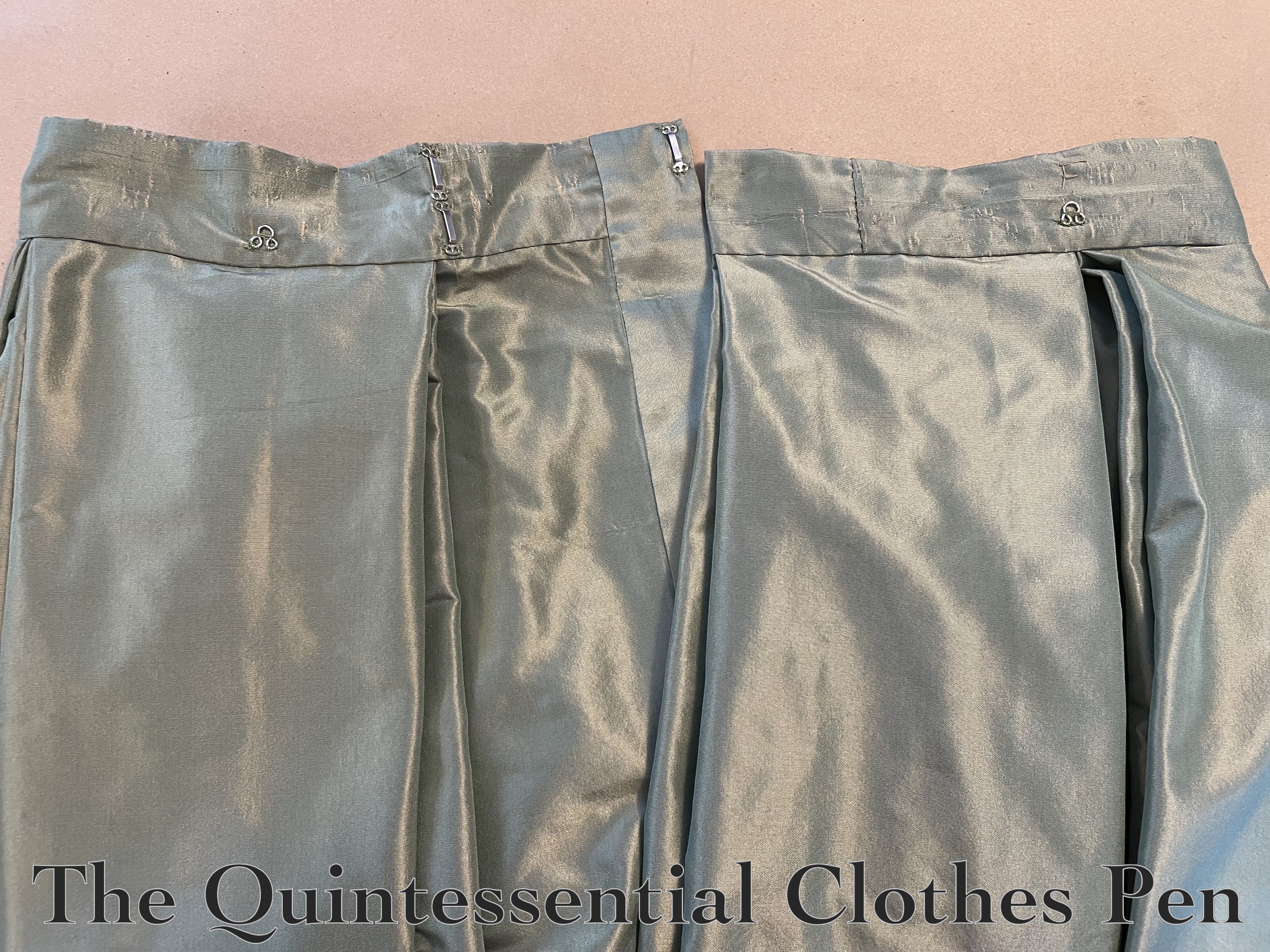 Once pleated, the sewing part was easy. All that remained was putting the waistband closures back on! Below is the updated waistband and placket from the outside of the skirt, with the placket hidden under one of the stacked box pleats. I reused the old waistband, even though it is a bit worn, because way not? It’s recycling and has patina!