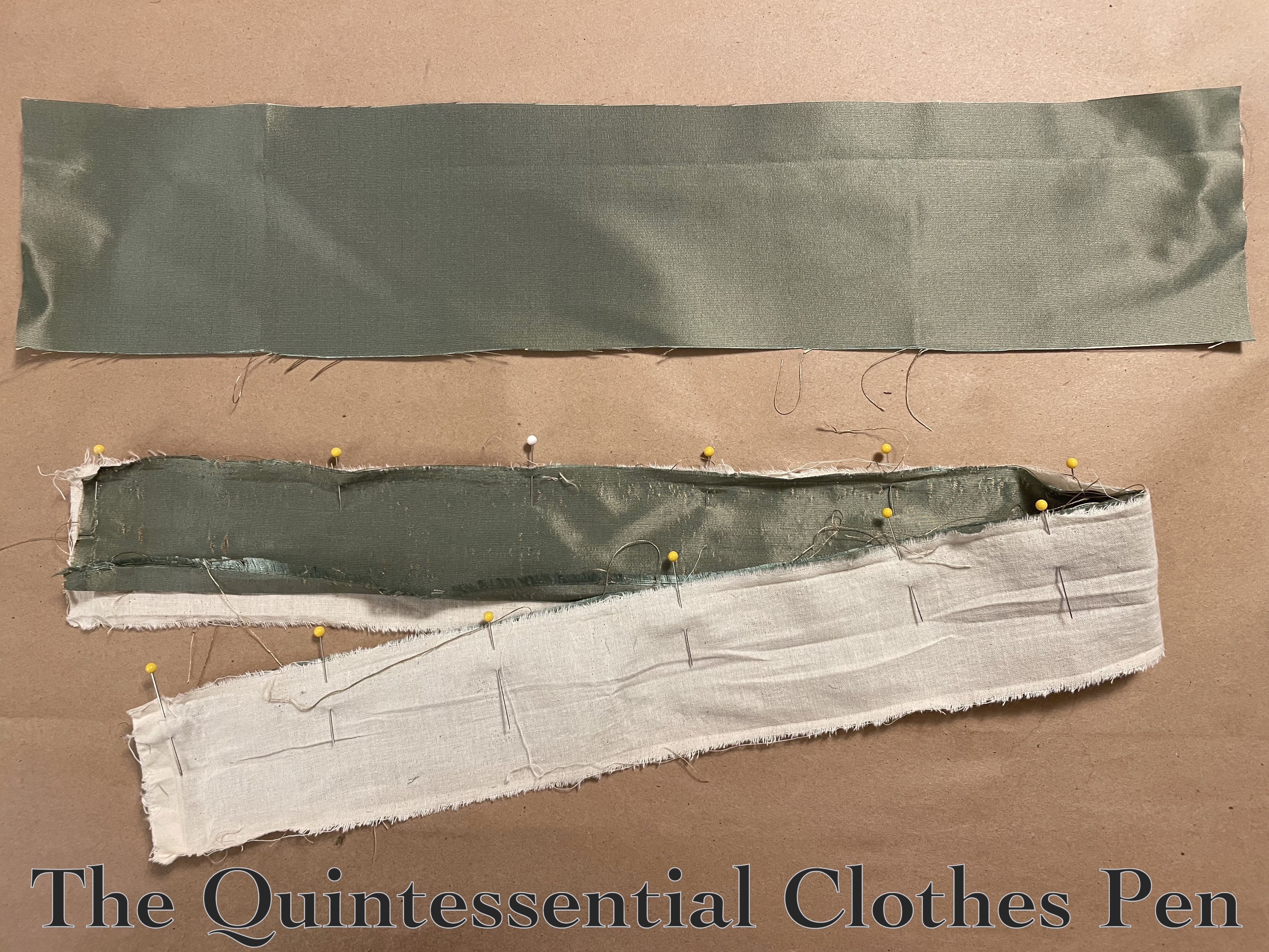 Next, I dug out my fabric scraps and cut an extension piece to make the new waistband larger. I also cut a piece to put a formal placket into the new skirt (to replace the previous opening, which had the raw edges of the silk and muslin turned towards each other and running stitched — that method wouldn’t work with the new all silk upper). You can see the old opening in one of the earlier photos.