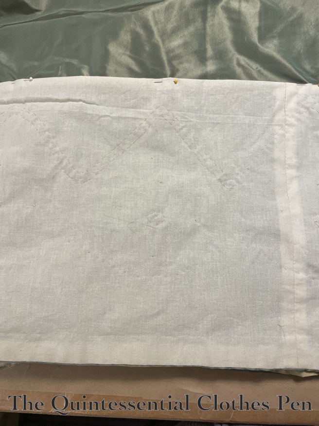 Below, a photo of the inside of the skirt with the muslin cut off to end just above the trim stitch lines. It’s pinned in place and ready to be slip stitched to become a wide facing.