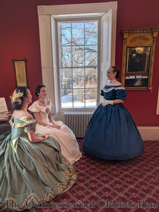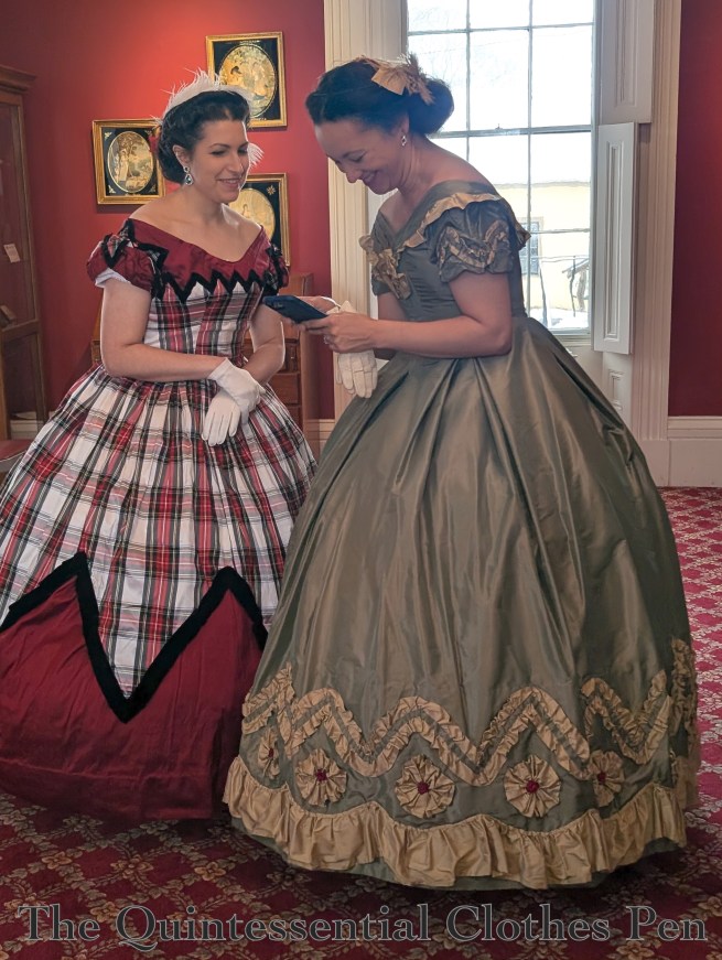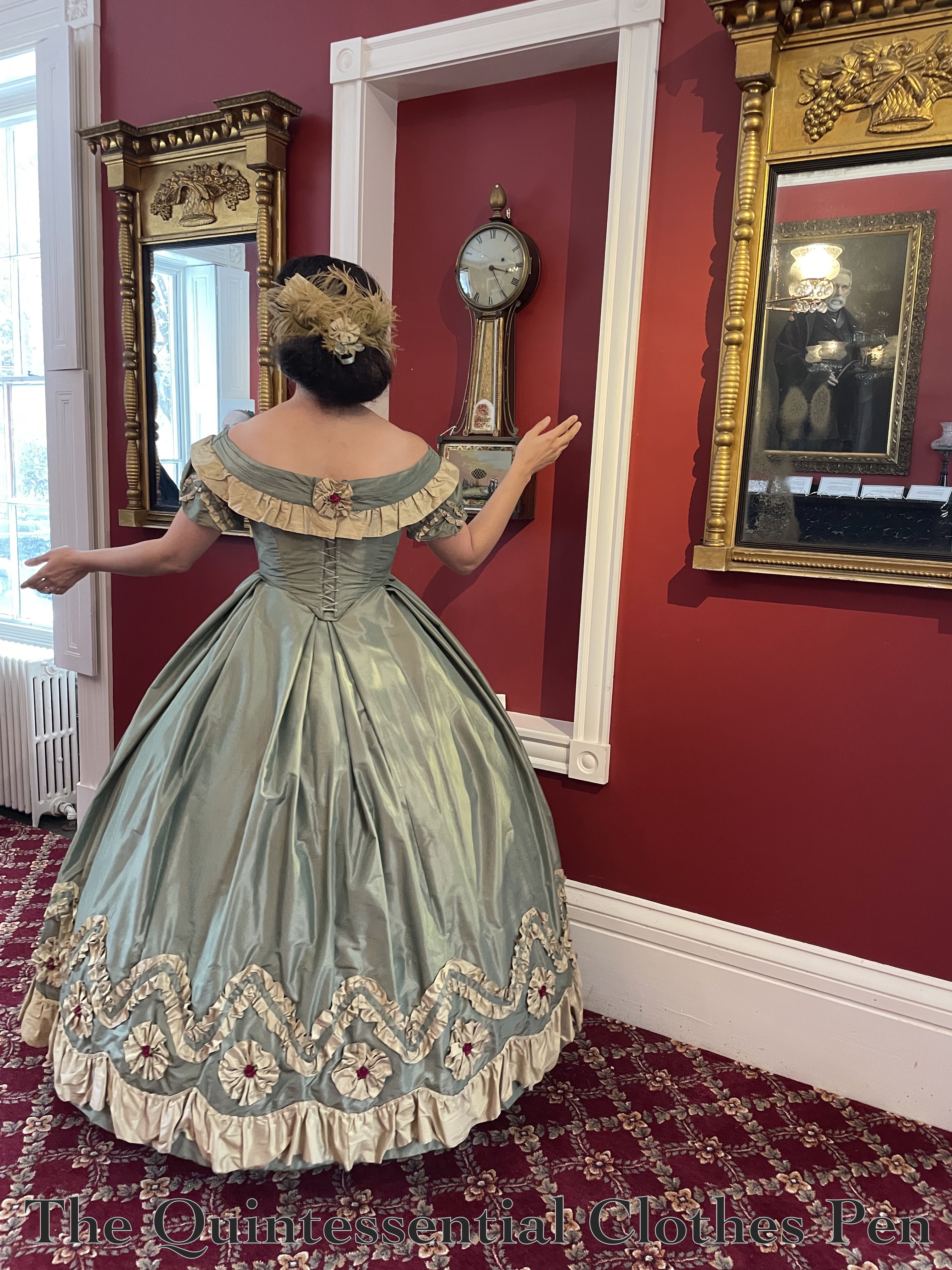 Back in 2013, I decided to prove to myself that a hand sewn 1860s dress could stand up to lots of wear by making a new dress and wearing it to many social engagements. Thirteen years later, I can say with confidence that the green and gold silk dress has held up well to many wearings, just as I knew it would!
