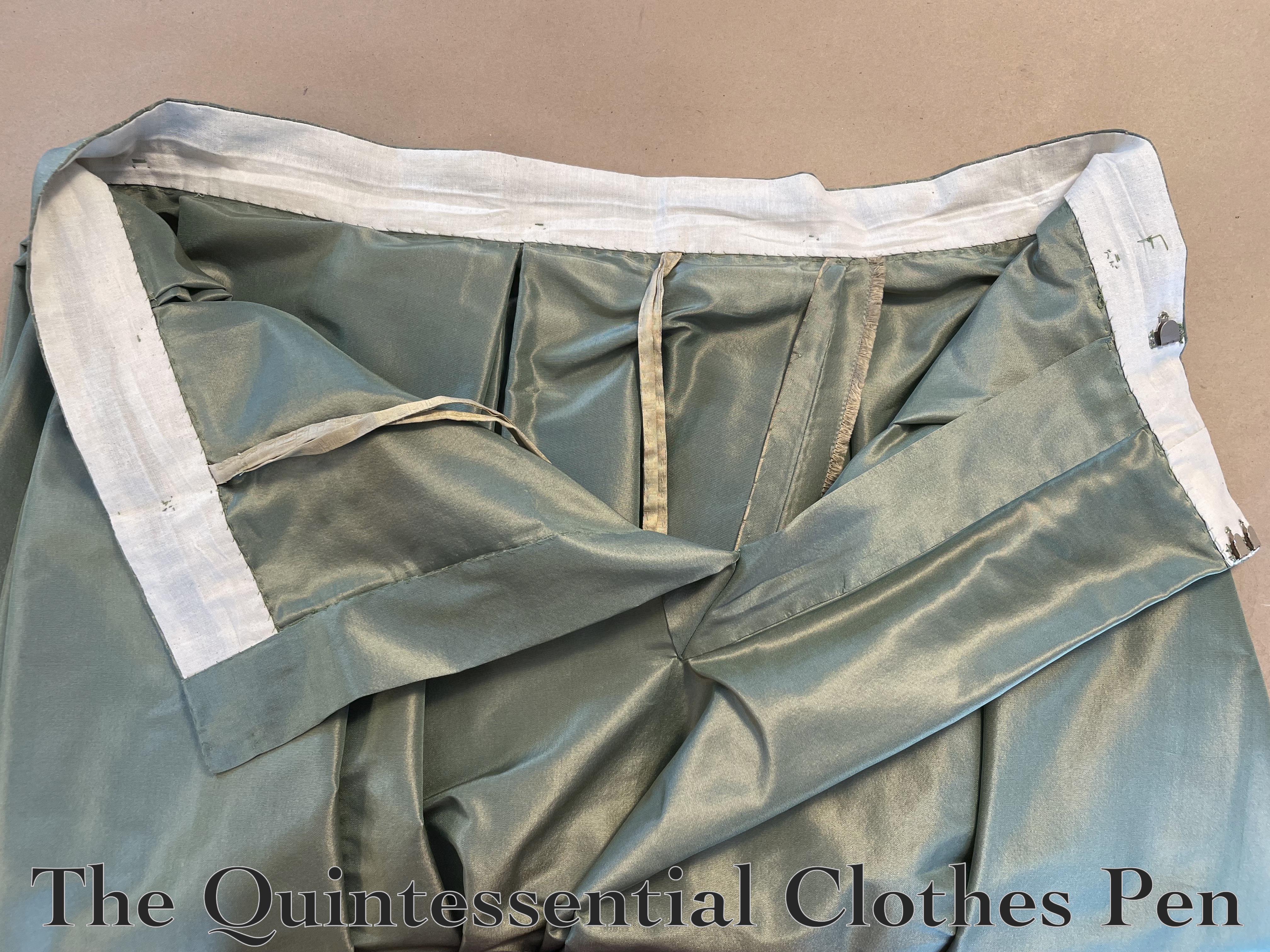 Below is a photo showing the inside of the skirt in its original form, with the muslin extending all the way up to the waistband. The box pleats were so thick there was no way to sew the waistband in a conventional way, so I turned all of the raw edges of the skirt to the inside and whipped the waistband to the top edges of the folded down pleats.