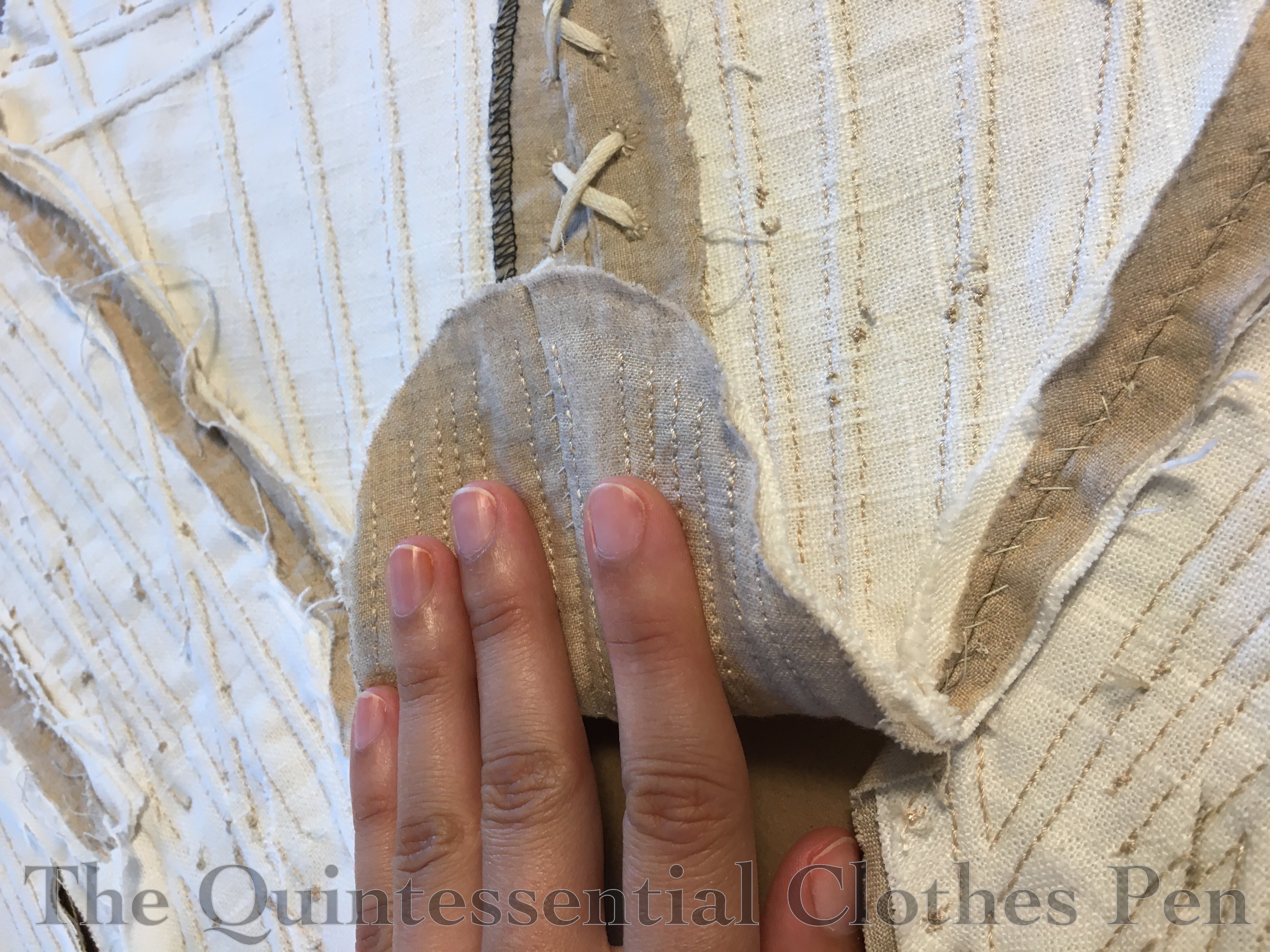 I had hoped to get all of my remaining construction details into this post, but progress on the stays has slowed. Plus, I realized I didn’t have enough linen tape to bind the edges, so new binding needed to be ordered. That has been done but I’ve been so busy that no sewing has happened yet. So for now, here are the middle parts of the construction update.