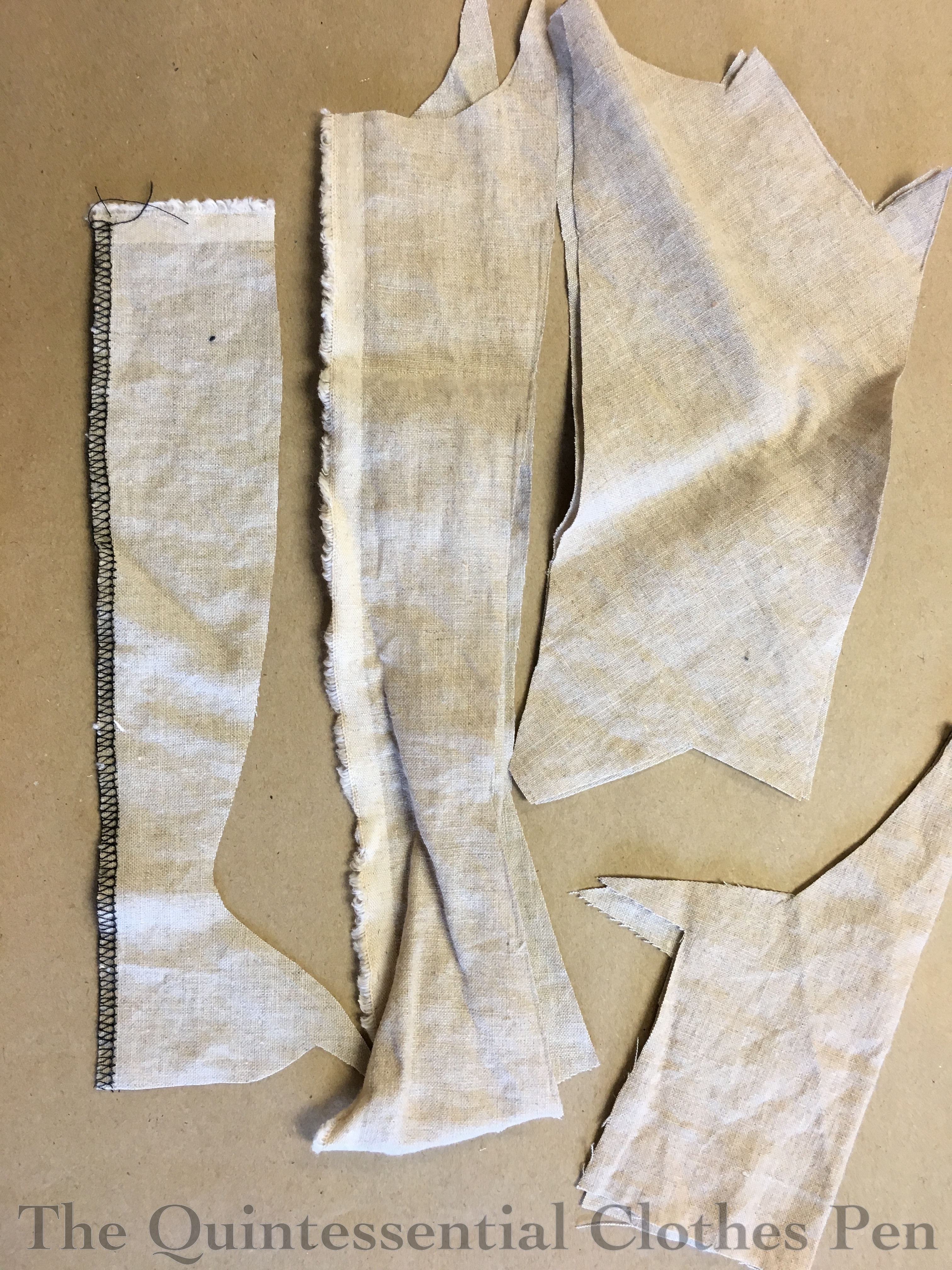 I didn’t process this earlier, in any of my fittings, or my mockup, or my patterning, or my looking at the book! And I’m incredibly low on fabric! Below are my scraps, minus the long ones in the center, which were already used to face the eyelets.