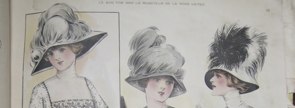 A selection of inspirational and awesome hats from a 1910 issue of the magazine Bon Ton. I particularly like the be-feathered hat on the far right...From the 1910 issue of Bon Ton. Look at how huge that head size opening is! And the feathers are just giant! I don't plan to attempt to create this, but I do think it fabulous!Another fabulously feathered hat from Bon Ton, 1910. Also included simply because it is wonderful, not because I intend to build it...