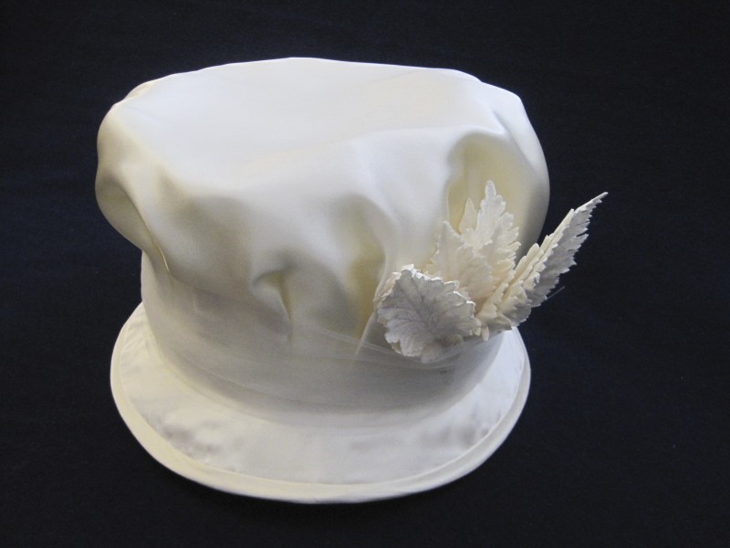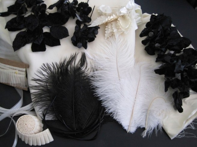The plan: to create an ivory and black hat to accompany my (almost) completed Titantic-era tea gown. I started with some ideas in mind, but was also open to inspiration from challenges of construction or materials. I raided my millinery trim stash for ivory and black millinery flowers and leaves, black and white ostrich feathers, pleated and plain ivory ribbons and trims, and other practical necessities like millinery wire, buckram, and organza…