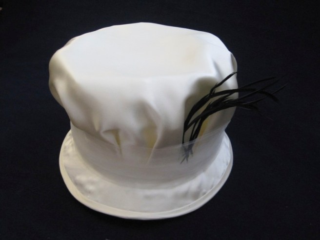 The specifics: wired buckram brim and sideband, ivory silk charmeuse flatlined with ivory cotton to cover the brim and crown, bias cut ivory silk shantung brim binding, trimmed with ivory tulle and black ostrich feathers, lined with the same ivory cotton as the flat lining. (Did you know that craft stores sell tulle in 6″ wide rolls 25′ long in all sorts of colors in the bridal section??? This is great for hats!)