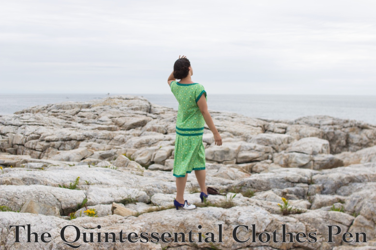 I’d bought the fabric thinking I’d make a rather simple 1920s dress, but the dress I’d been pursuing wasn’t quite that–and the length was longer than I had yardage for. So it was back to Pinterest to find another idea. I settled on using the green dress below, another one I’d been eyeing for years, as my inspiration.