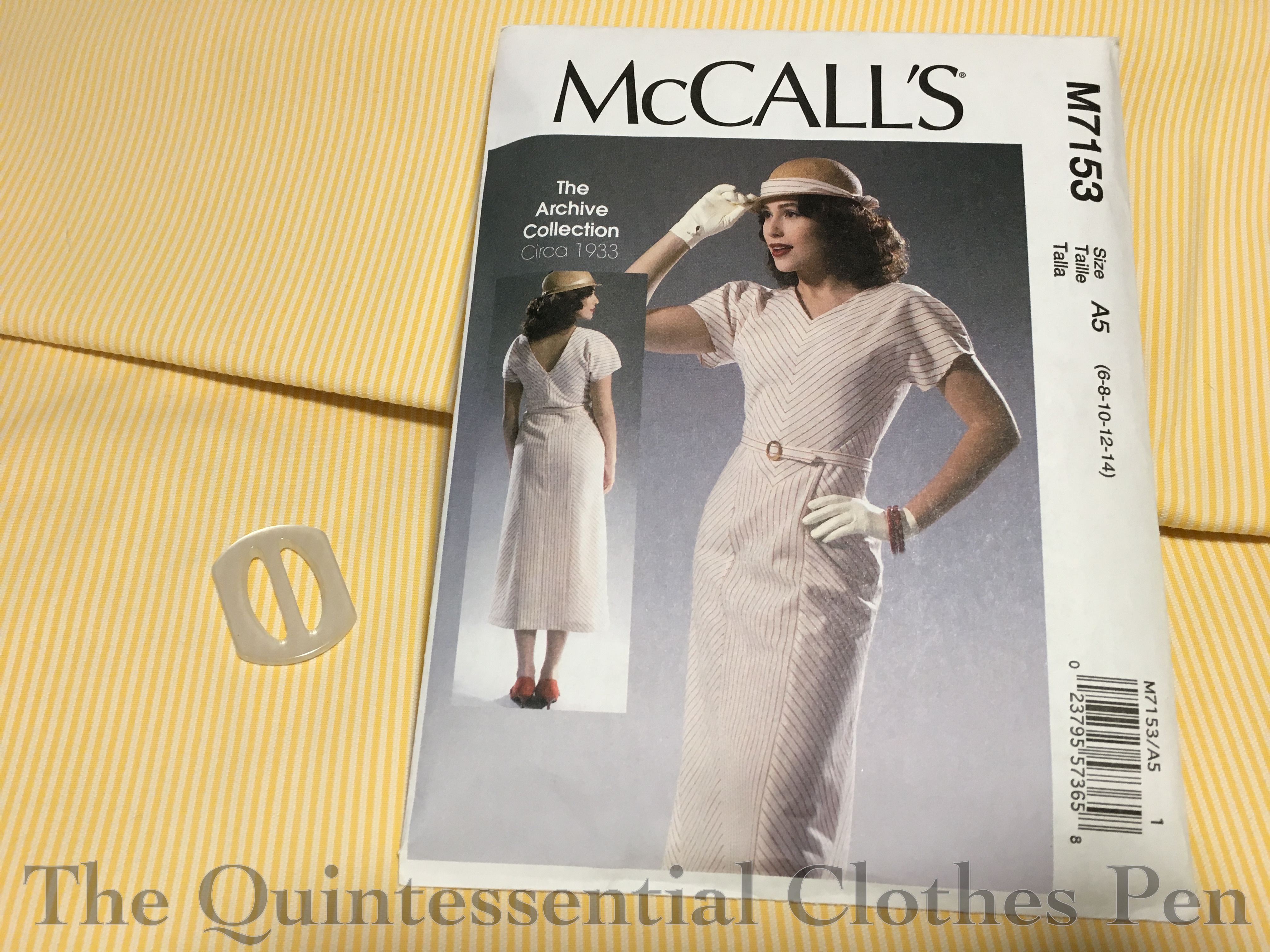 The style of the dress is quite defined by the differing grain lines on the pieces, a detail that is set off by the stripes used for the sample dress. Accordingly, I went off in search of a good stripe for the dress. I couldn’t find one I liked in the right weight with a stripe quite as delicate, visible, and widely spaced as the sample dress, but I did find a lovely yellow and ivory narrow stripe at Farmhouse Fabrics (although now they have this, which is similar to the sample dress–I’m not sure which one I would choose if I had both options in front of me now!). I couldn’t find a yellow belt buckle that was right, so I decided to go classic with a white mother of pearl one from my stash instead.
