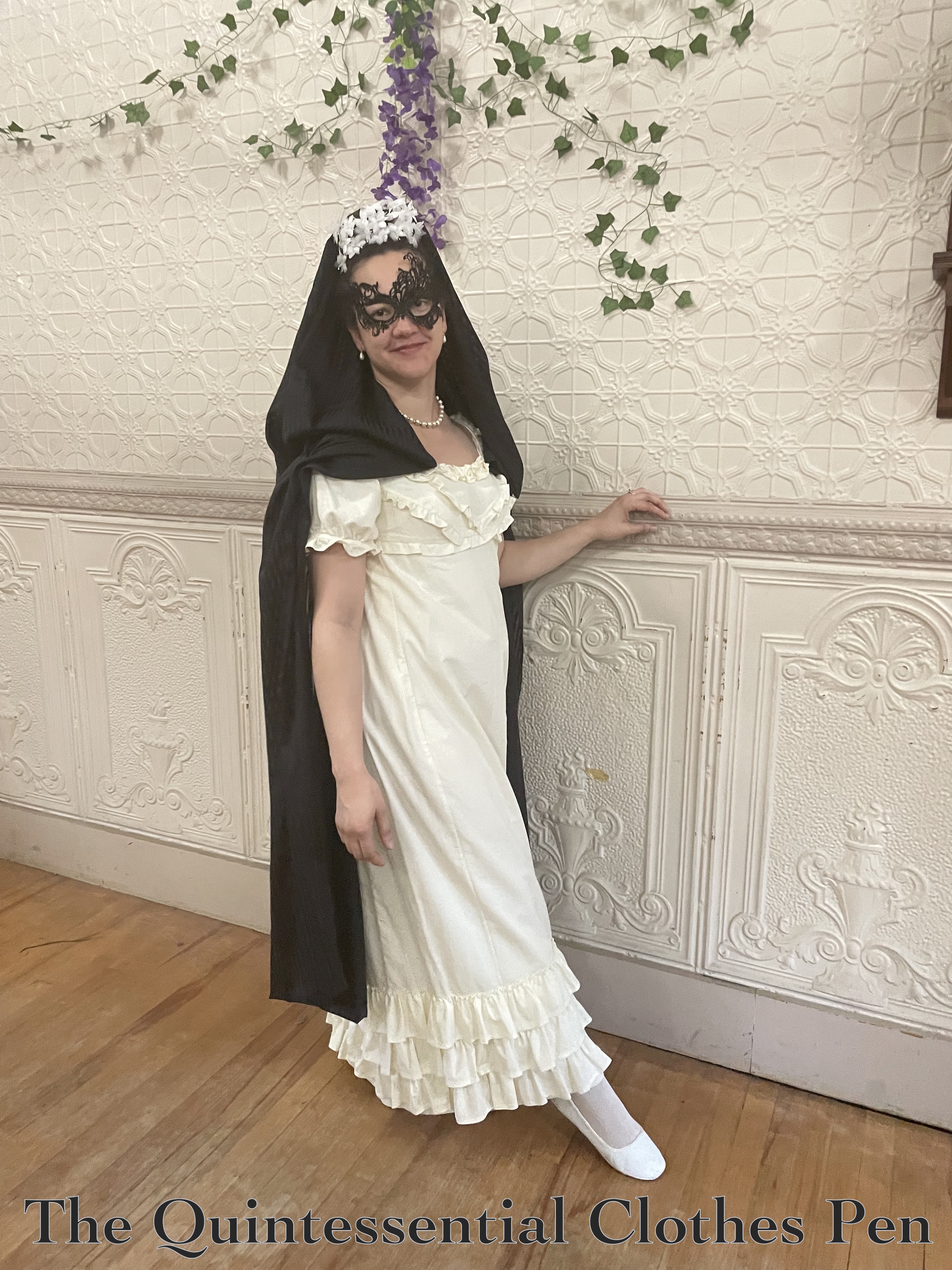 More recently, however, I have had more opportunities to wear clothing from this period, as The Footwork and Frolick Society has hosted a few events with themes that can include the 1880s. Therefore, I decided to re-trim the Fancy Dress dress into a more regular, less Fancy Dress, ballgown style for the Yuletide Ball in 2024.