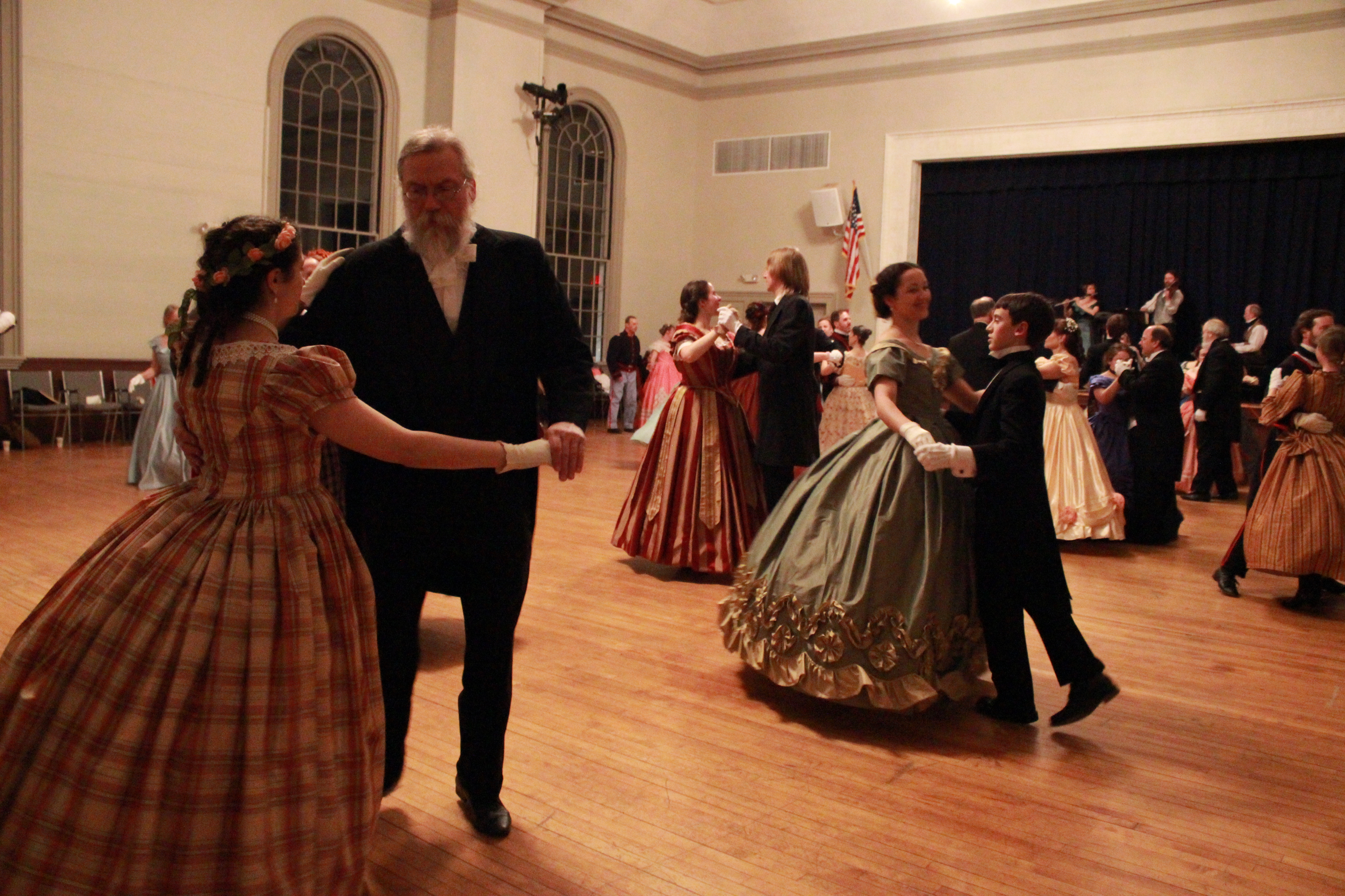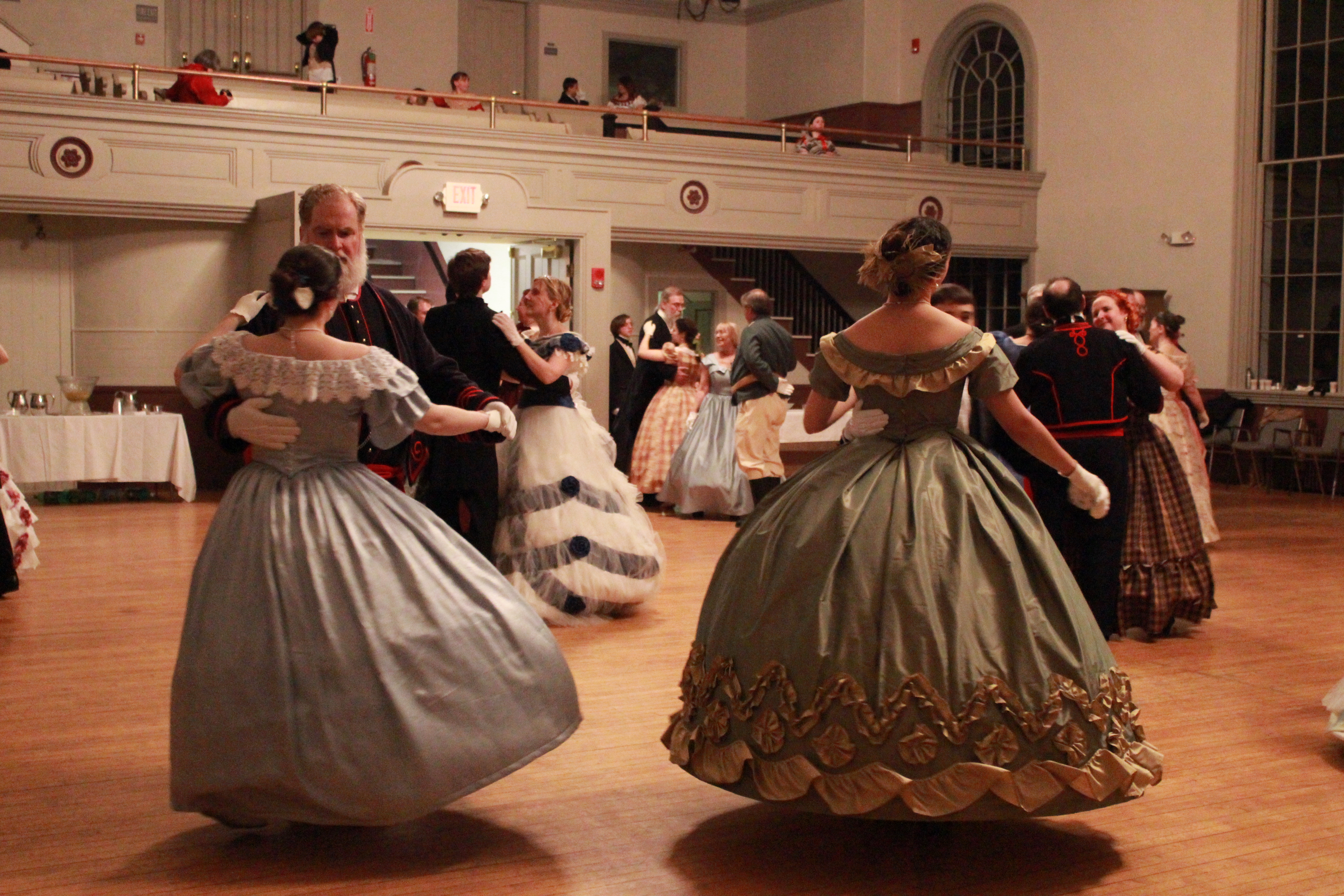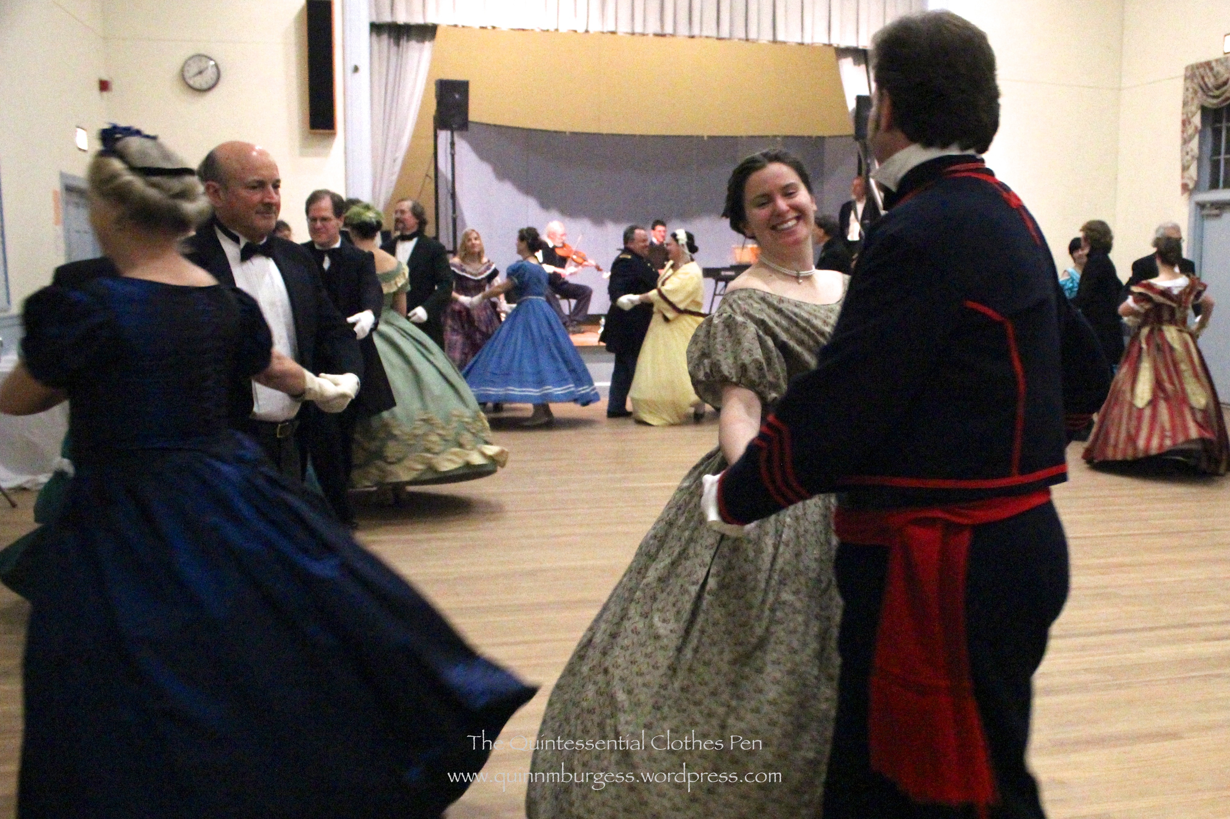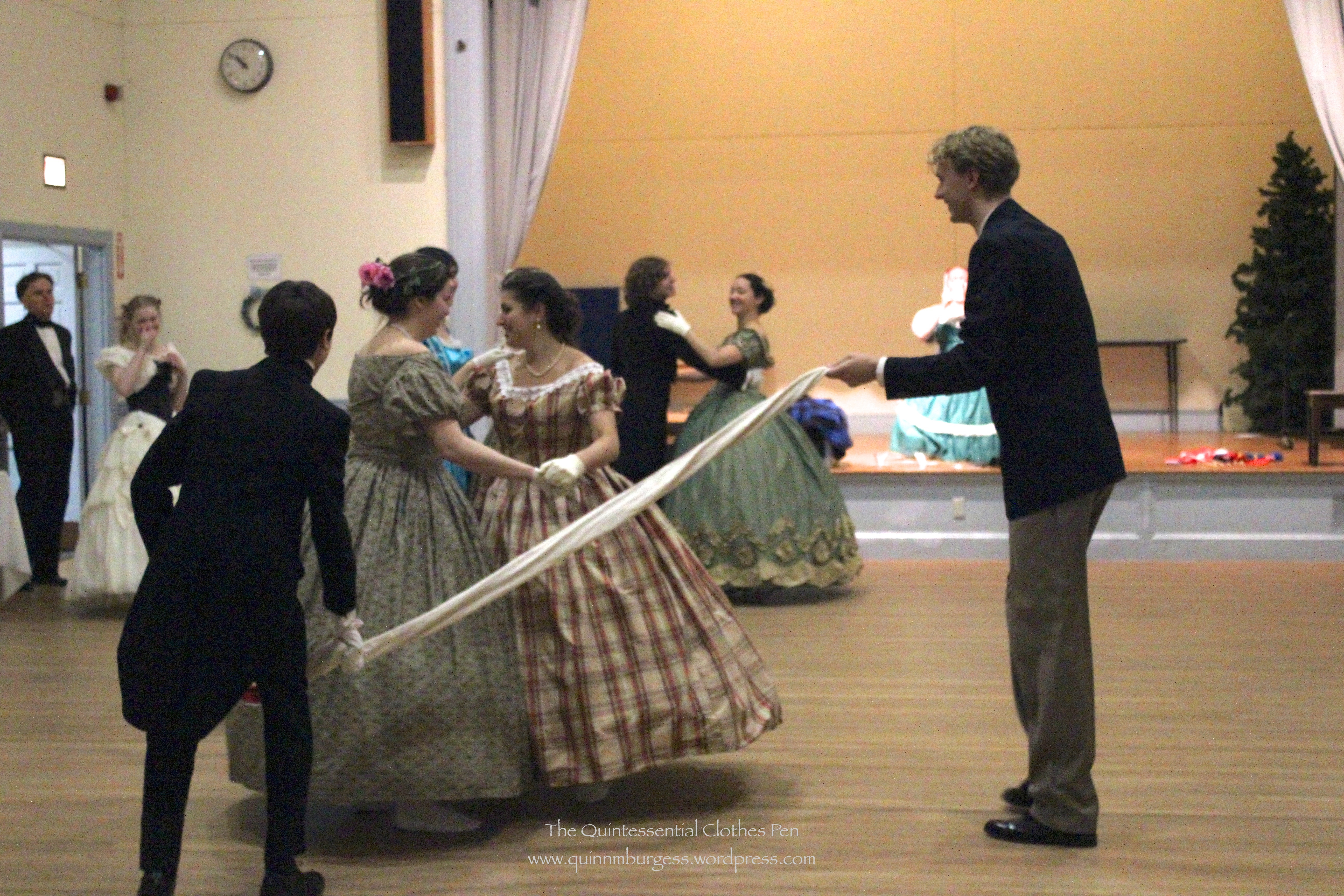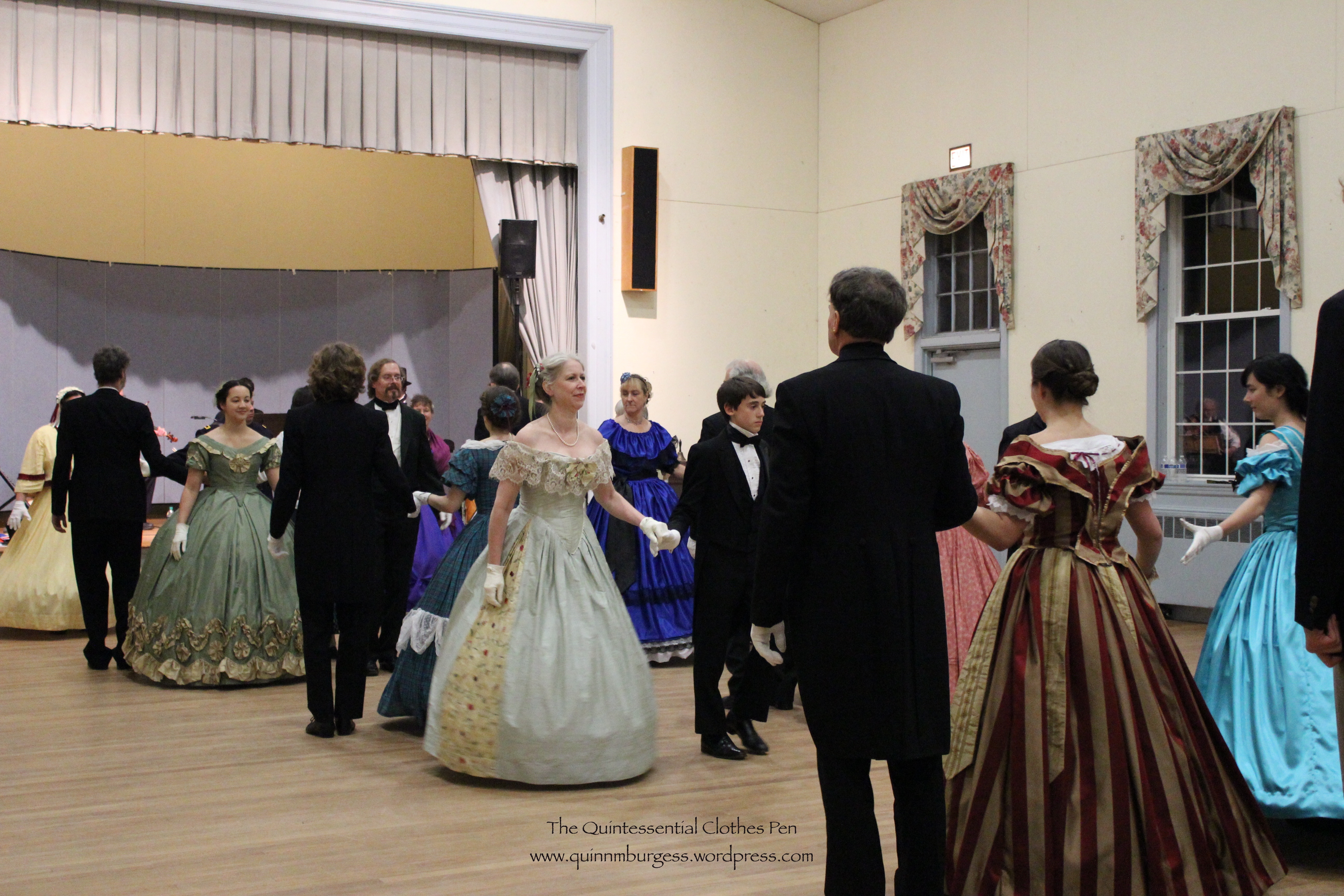 Taking some photos before the ball.I wore Evie. This is a nice photo of the bodice with recently added sleeve trim.Plaid dresses!Something exciting was being said, though I don’t remember what! This is good proof, though, that my Evie hair wreath does often take on a very green hue in contrast to the sometimes gold-ish brown that it looks in pictures.In lines, dancing Le Tourbillion.Dancing in a large circle. This is either Spanish Dance or Soldier’s Joy. I always get them confused since they start out similarly!Lines of ladies and gentlemen dancing Gothic Dance.Ladies passing under the “Gothic” arches!Wondering what this odd scene is? This is one of the dance games in the German. You’ll have to forgive me for not remembering the names of them. In this one, a lady sat in the chair with a mirror and cloth. She could see the gentleman standing behind her in the mirror. She would wipe the mirror to dismiss them until she found one she wanted to dance with.In this dance game, the lady presented one of the two gentlemen with a glass of “wine.” She then danced with the other gentleman.For this dance game, the gentlemen were blindfolded (I was dancing as a gentleman…). We all stood in a circle with ladies in between gentlemen and then would begin to give hands, right then left, around the circle. Because the gentlemen were blindfolded the ladies had to be sure to catch their hands to keep them from wandering out of the circle. At the sound of a whistle, you would dance with the person whose hand you were holding. Something must have been mixed up, because two of us blindfolded “gentlemen” wound up dancing together, to the great amusement of all onlookers. Lucky for us we’re both proficient waltzers, and being blindfolded isn’t much of a challenge. People were quite impressed and amused.Another dance game, with 5 each of ribbons, ladies, and gentlemen. Once the center of the ribbon was released each person found the person holding the other end of their ribbon and danced with them.This dance game involves two people trying to capture one of the dancing couples in the sash. When they’ve caught someone they switch around so different people are the ones holding the sash. The people dancing have to try to dance away from capture.It’s hard to see, but the couple with the plaid dress is holding a top hat. The object of this dance game is for the second couple to dance close enough to the couple with the top hat to drop a glove into it. When that happens then the couple with glove becomes the couple with the hat. Only dancing, not running, is allowed to elude the couple with the glove.