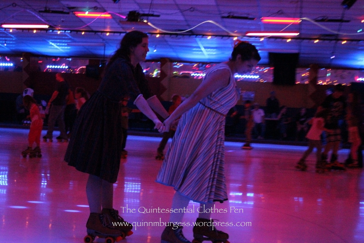 After eating brunch at a 1950s themed diner, stopping along the side of the road to take lovely autumn color pictures, and spending some time at a thrift store before the roller rink opened, we finally headed out to go roller skating! I had been jokingly warned that we were likely to be at the roller rink with a whole lot of 8 year olds and the warning was pretty accurate. There were a few adult couples on dates and a few by themselves, but mostly there were a ton of 5-13 year olds and their adult chaperones. It was a Saturday afternoon, after all, so it was to be expected that there would be a lot of birthday parties… It didn’t bother us, though, we’re used to being unique. And lots of the girls called out that they liked our dresses as we skated by. Perhaps one day they’ll be inspired to make or wear historic clothing!
