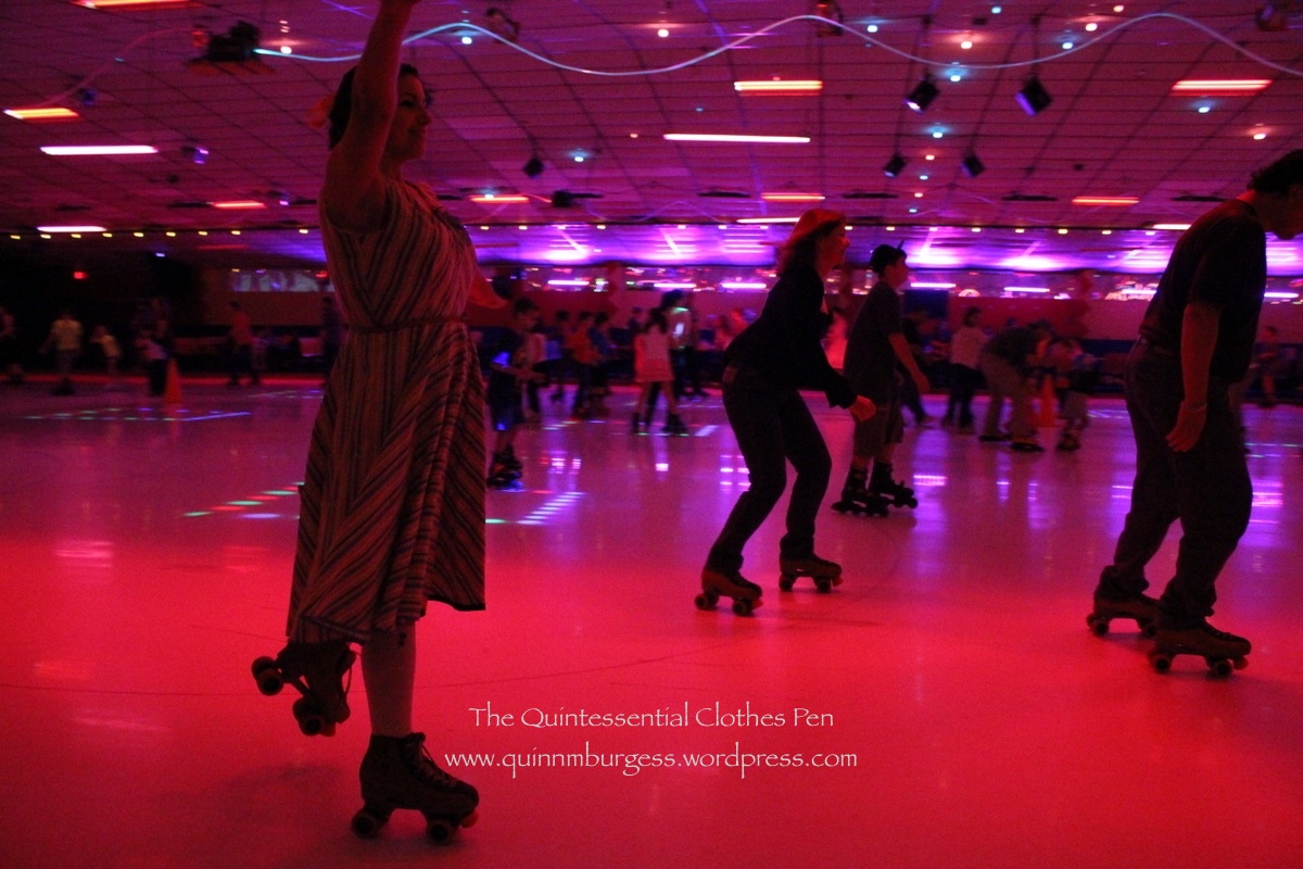 Putting on skates under a black light.Things started off a little shaky for some of us.But we were there to support each other.In fact, I almost fell over before I even made it onto the rink… But I managed to keep my balance, and here I am, successfully skating!Our confidence rose pretty quickly, and soon we were all making it around the rink.We were even managing to be graceful sometimes.And possibly even in sync…I did still lose my balance sometimes and make crazy faces…But they were balanced out by the successful moments.Look, here’s another successful moment!On a roll!This picture amuses me, because we might be dancing, or we might just be loosing our balance…Group shot (with fun lights!).Another group shot…You might remember our “raise the roof Charleston”… We just like to throw in raising the roof any chance we get, and this was a perfect opportunity.It almost looks intentional that we’re all in a line!Full circle. Returning my skates under the black light.