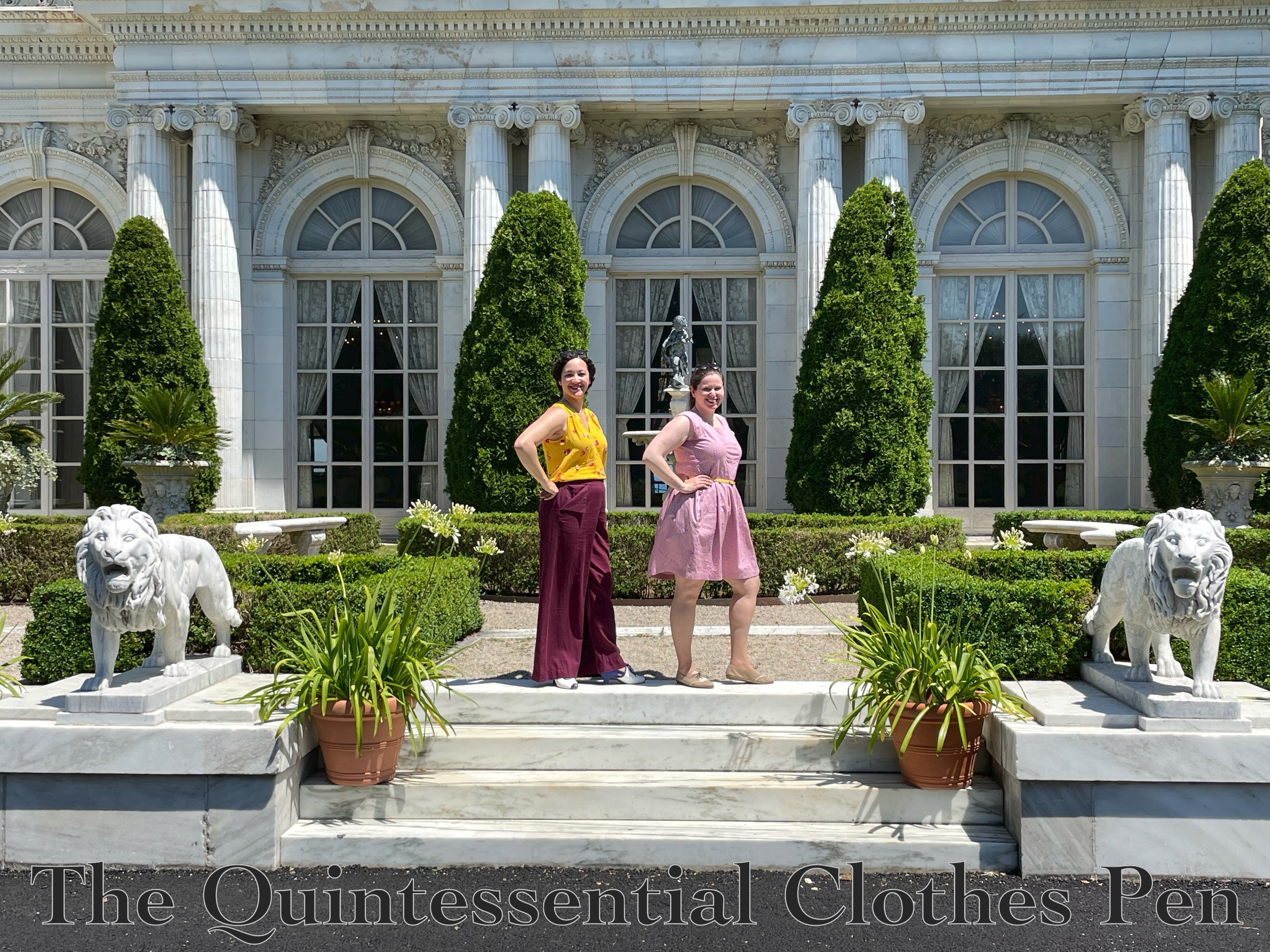 Practicing our 20s poses with the Crane Estate behind us.The view from the house looking out towards the ocean. Those lovely rolling hills don’t look that big, but I promise you they are!Did you happen to notice the statues along the edges of the grass?Well you know silly-ness often happens when I’m around…So we each took turns imitating the statues.When you’ve walked all the way to end of the hills, this is the view that greets you.Lovely!Looking back at the house from the farthest point with the grounds full of people.Looking over the Italian garden tucked away from the main house.While in the garden we took the opportunity for fun photos: telling secrets…Lounging on the rails…Posing with sporting equipment…Admiring the flowers…And playing with accessories and wrought iron gates!There were vendors of vintage items, which were fun to look through. I especially like this dress!And we met some well dressed new people!We also took part in the dancing, especially when there was a song to which we could dance a Charleston!By the end of the day I was feeling pretty tired along with everyone else I was with. We took the opportunity to explore the side of the house that had parking space rather than dancing action, which was quiet and relaxing. This side of the house looks out over marshes.