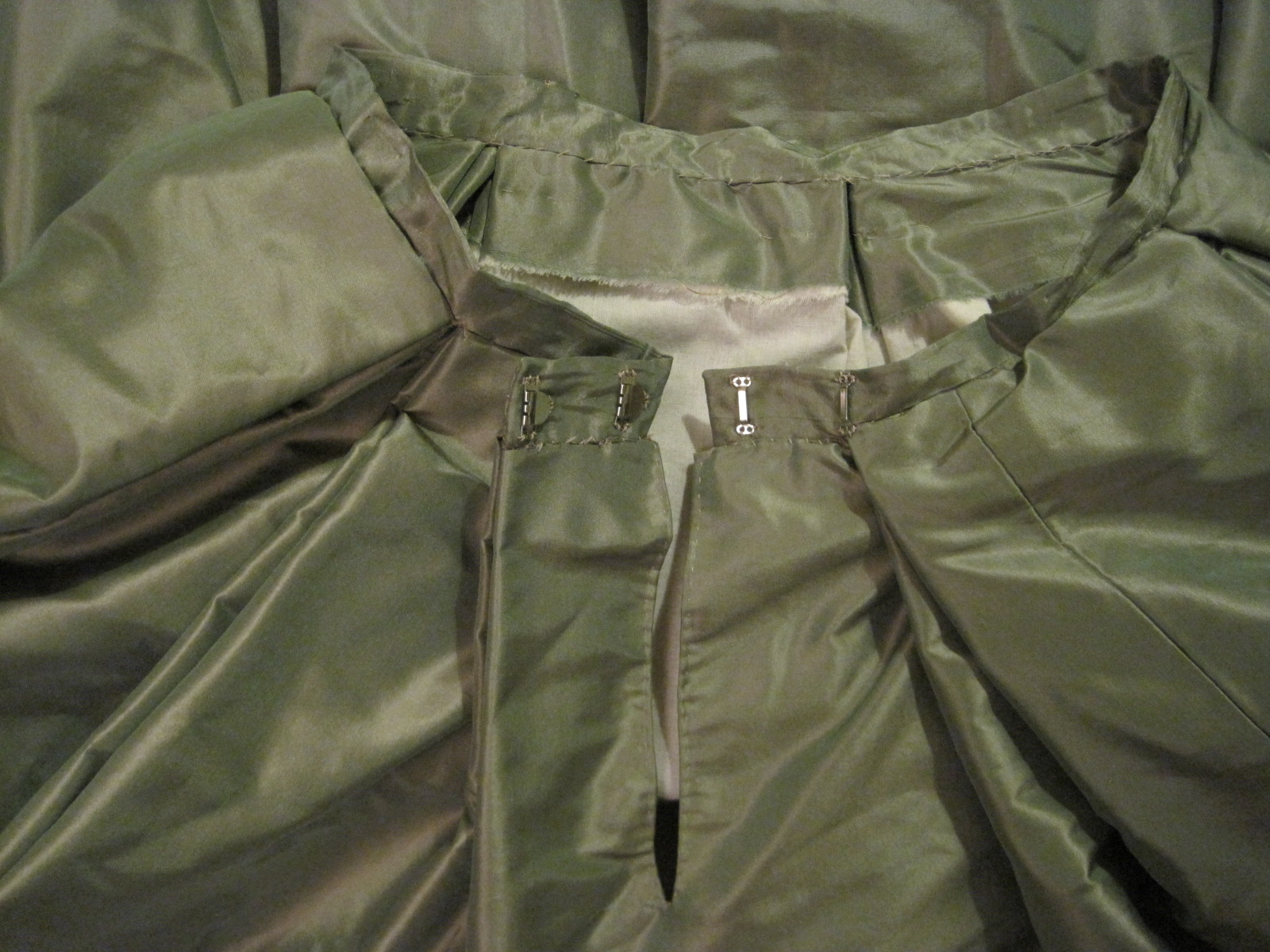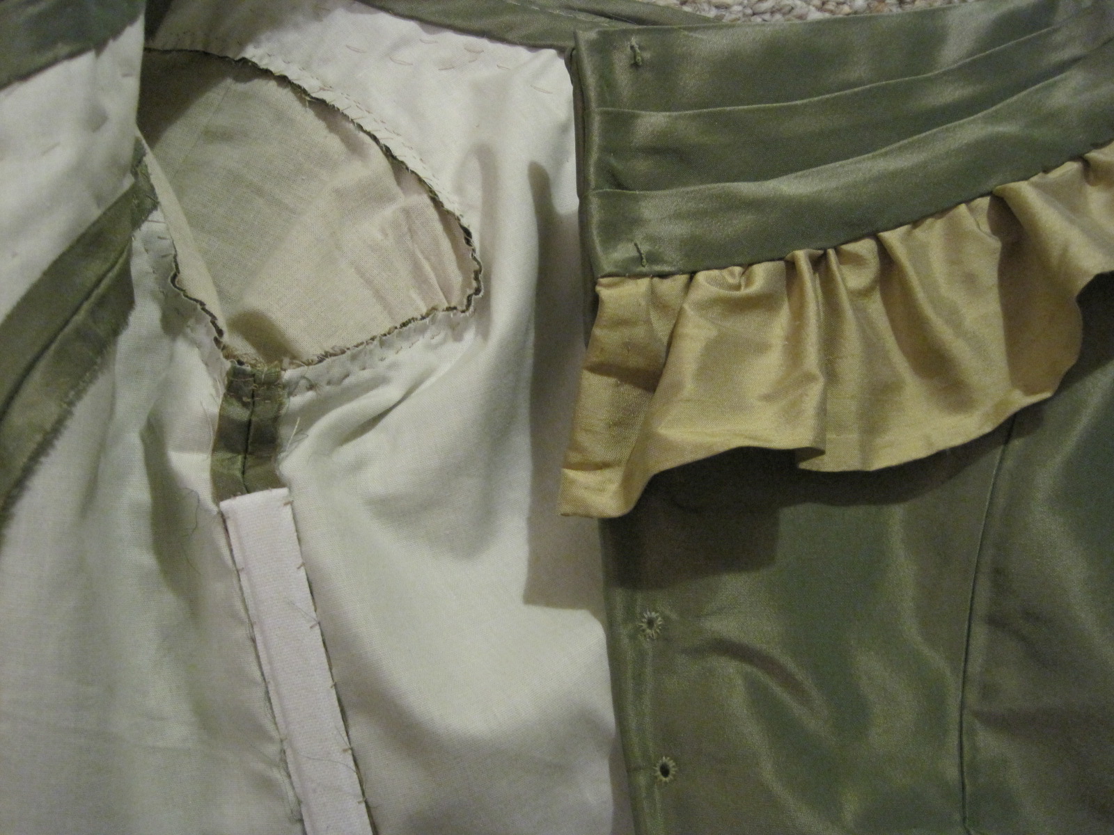 Fabric: small bits of leftover gold silk shantung and green silk taffeta from the construction of the dress.