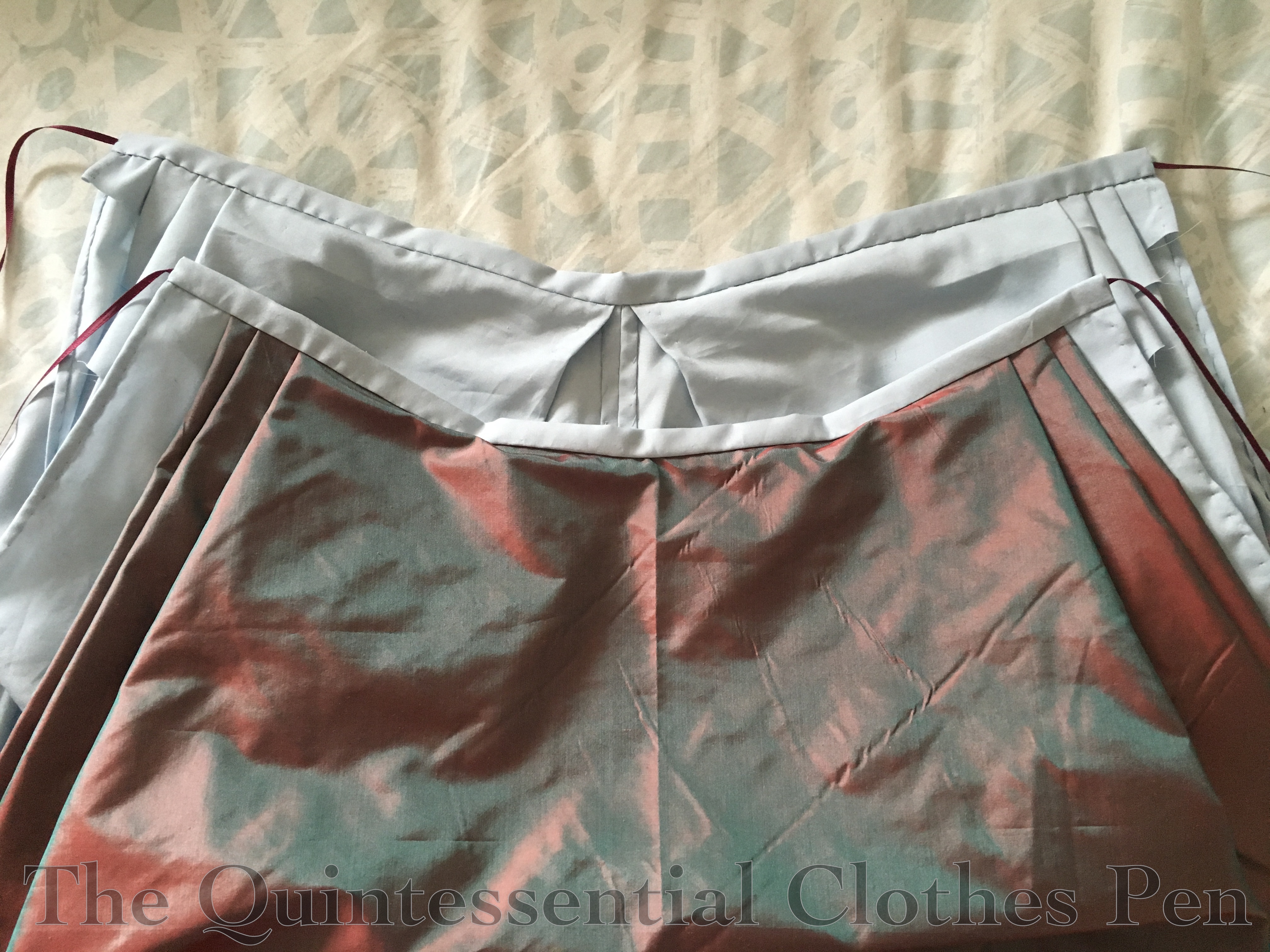 One of the things that I’d struggled to capture in photos for the Versailles dress’s first wearing was the changeable nature of the silk fabric. It is a ‘shot’ fabric, meaning that it uses two different colors woven in opposite directions: a vibrant turquoise and a deep red. This means that fabric appears to be both colors, or a mixture that looks a bit purple, depending on how the light hits it.