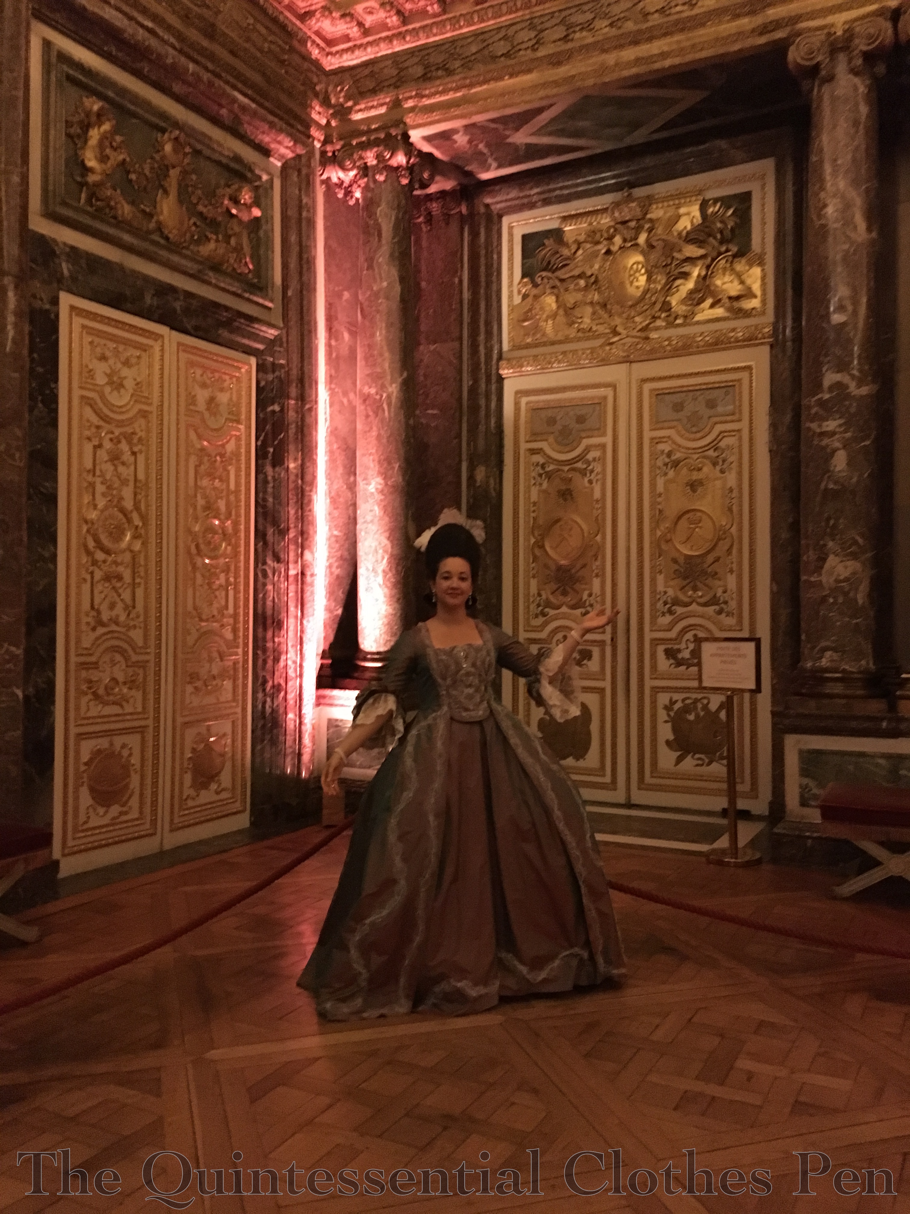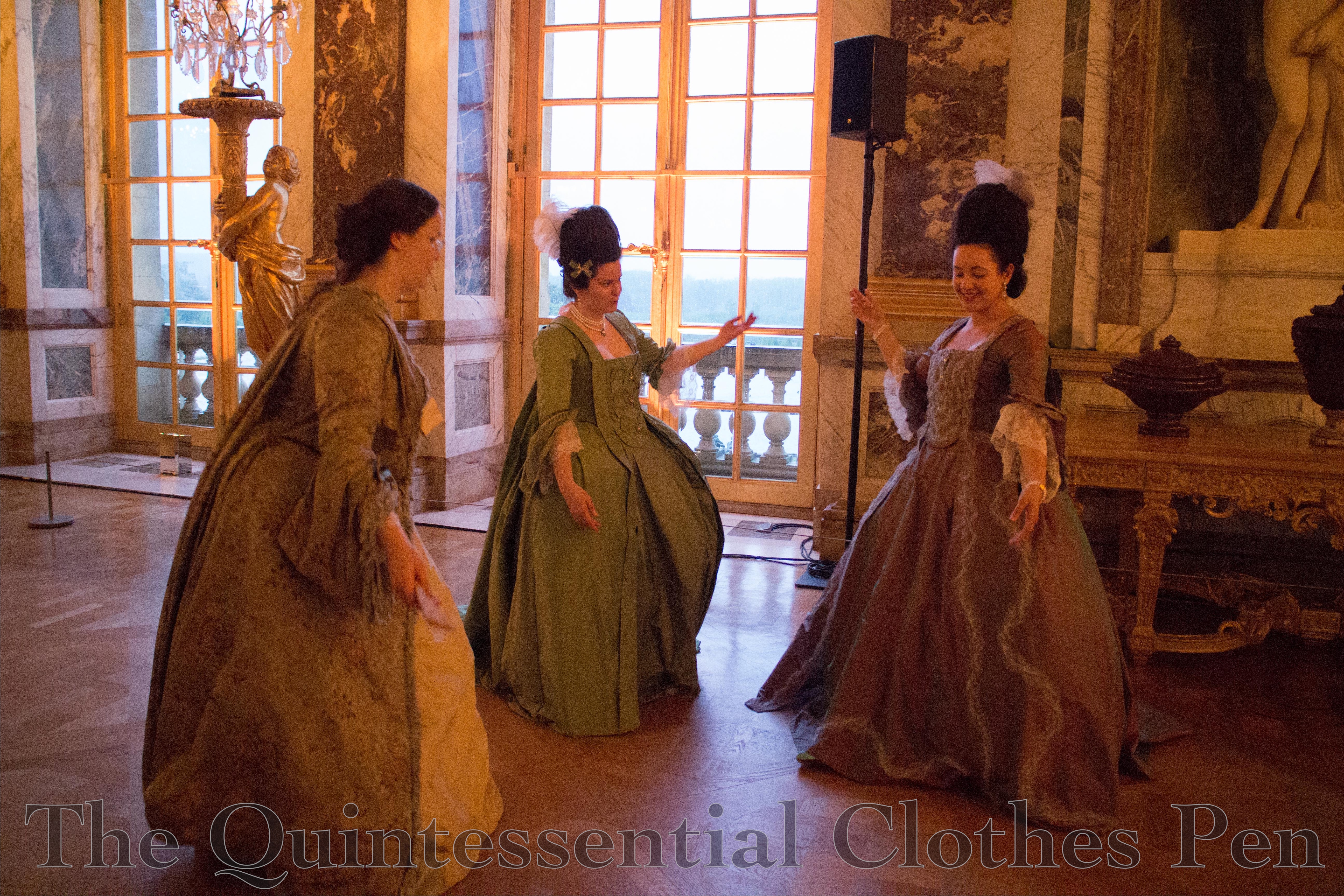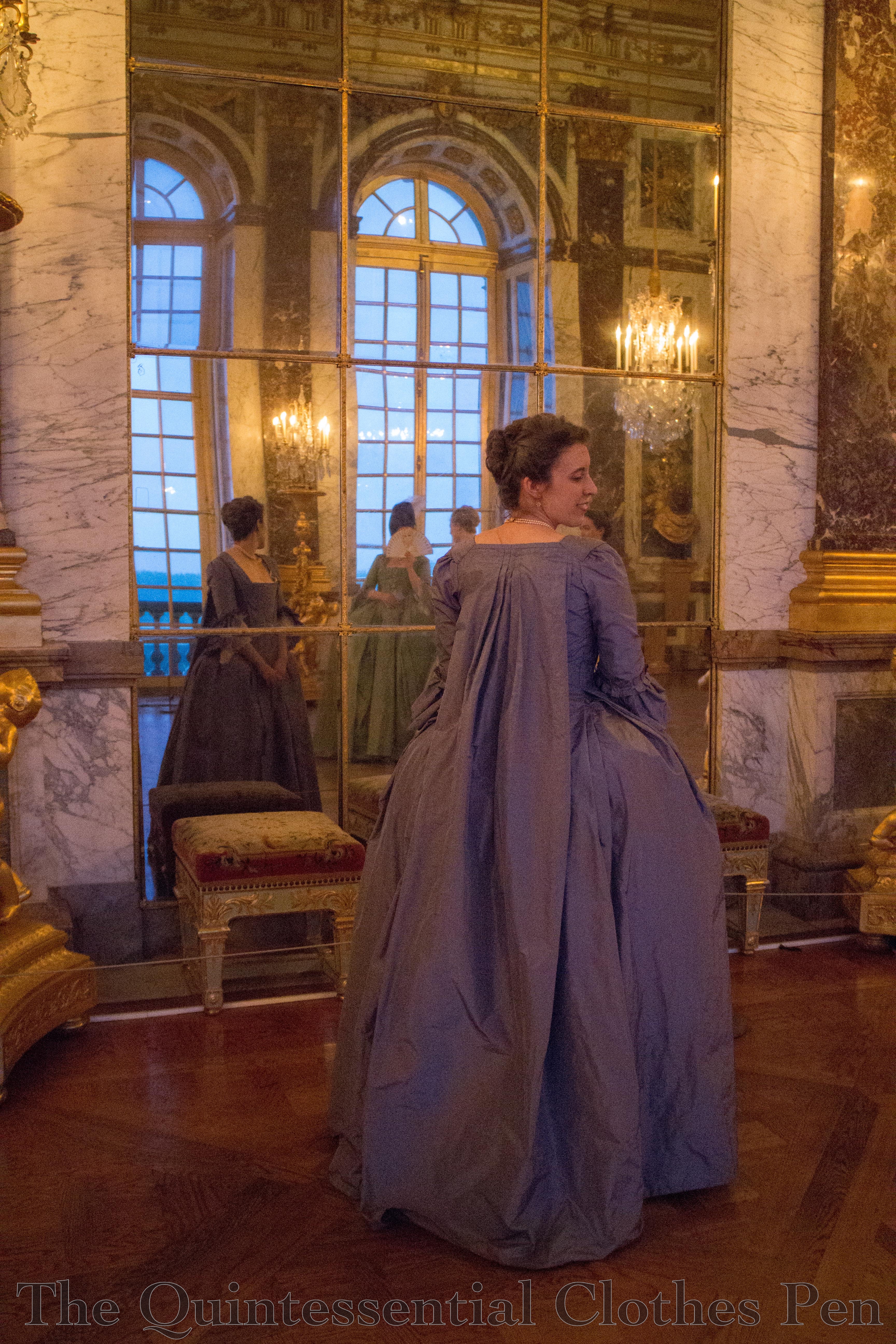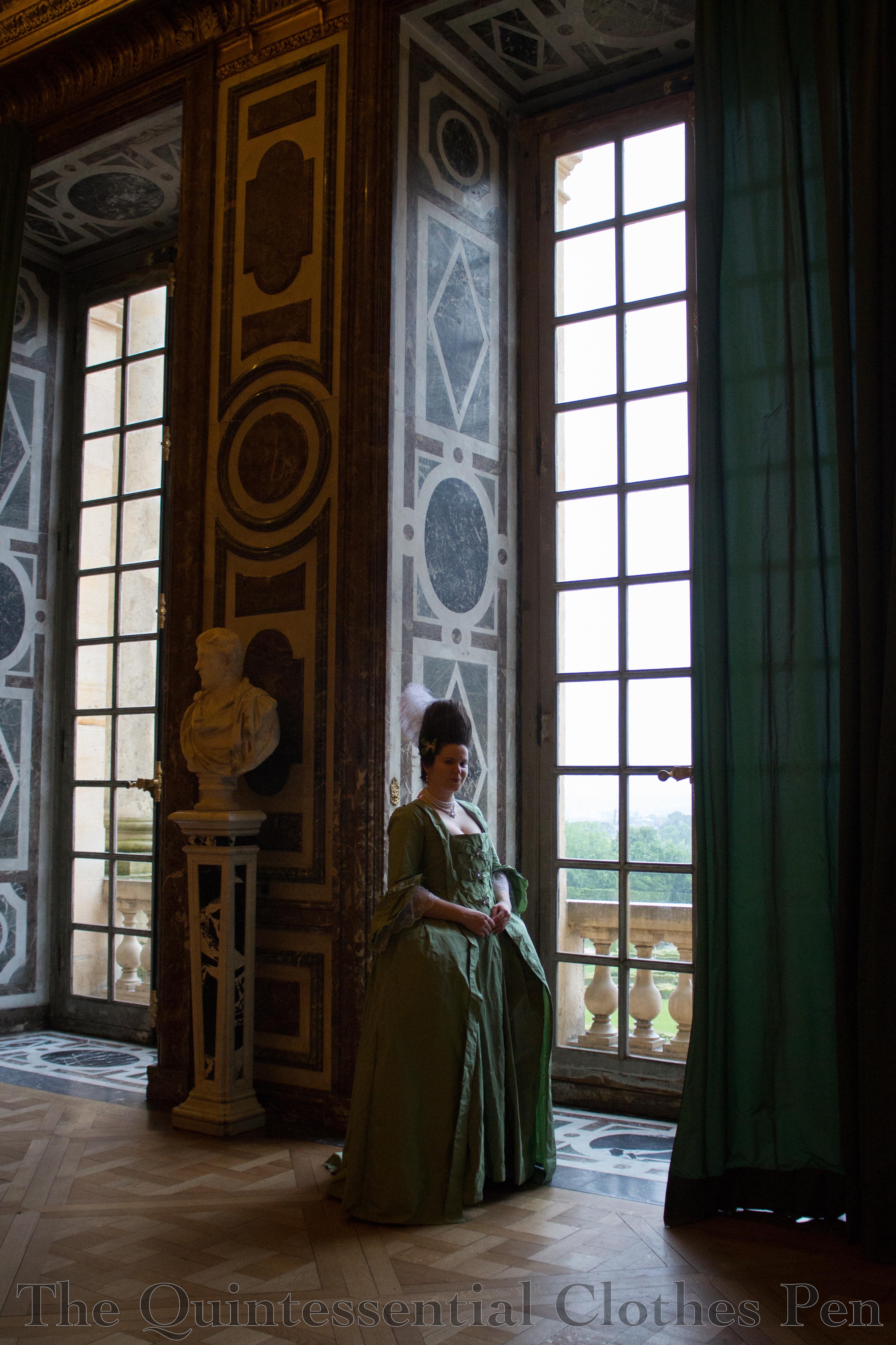 I was so pleased that my American Duchess Kensingtons were still in good shape after the immense amount of rain they endured in 2016. It was really exciting to break them out again with this dress! I’m still chuffed with the metallic lace I added. For Versailles, more bling was the thing! And in this photo, you can see how the light turquoise paint color picks up on the hints of turquoise in the dress fabric!