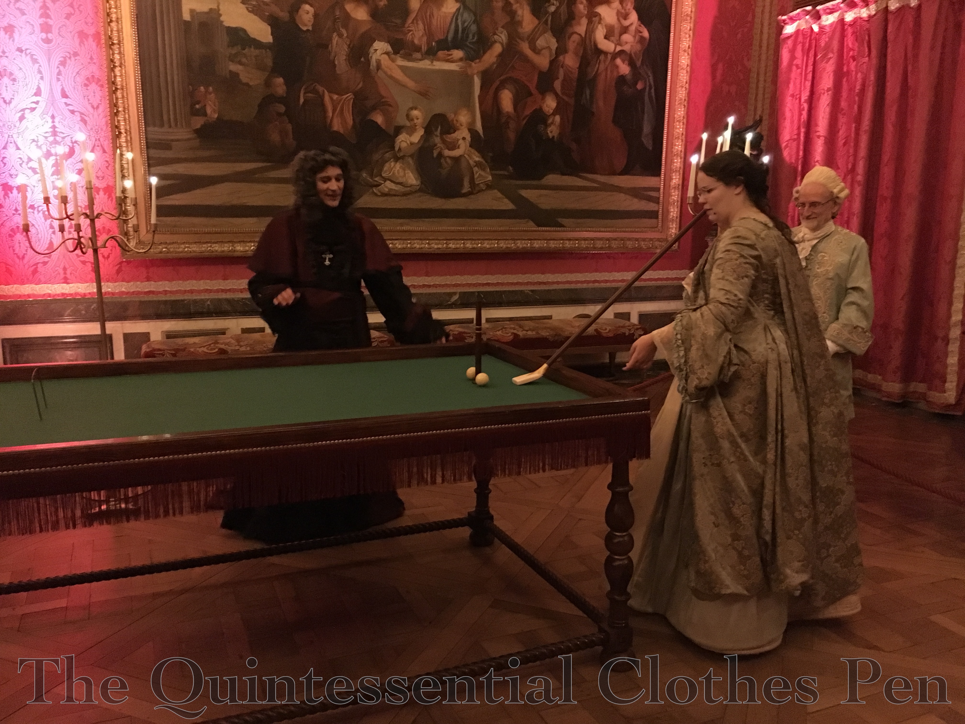 For the formal evening part of the event, I chose to wear my Versailles Sacque (made and last worn in 2016, which I posted about here)! For this wearing, I updated the ensemble with a lace tucker around the neckline of the dress. This small new accessory helps complete the full look. It took a little bit of referencing my old blog posts to reconstruct my hair form and remind myself what accessories to wear, but I was successful. I was very grateful to myself for documenting things so well!