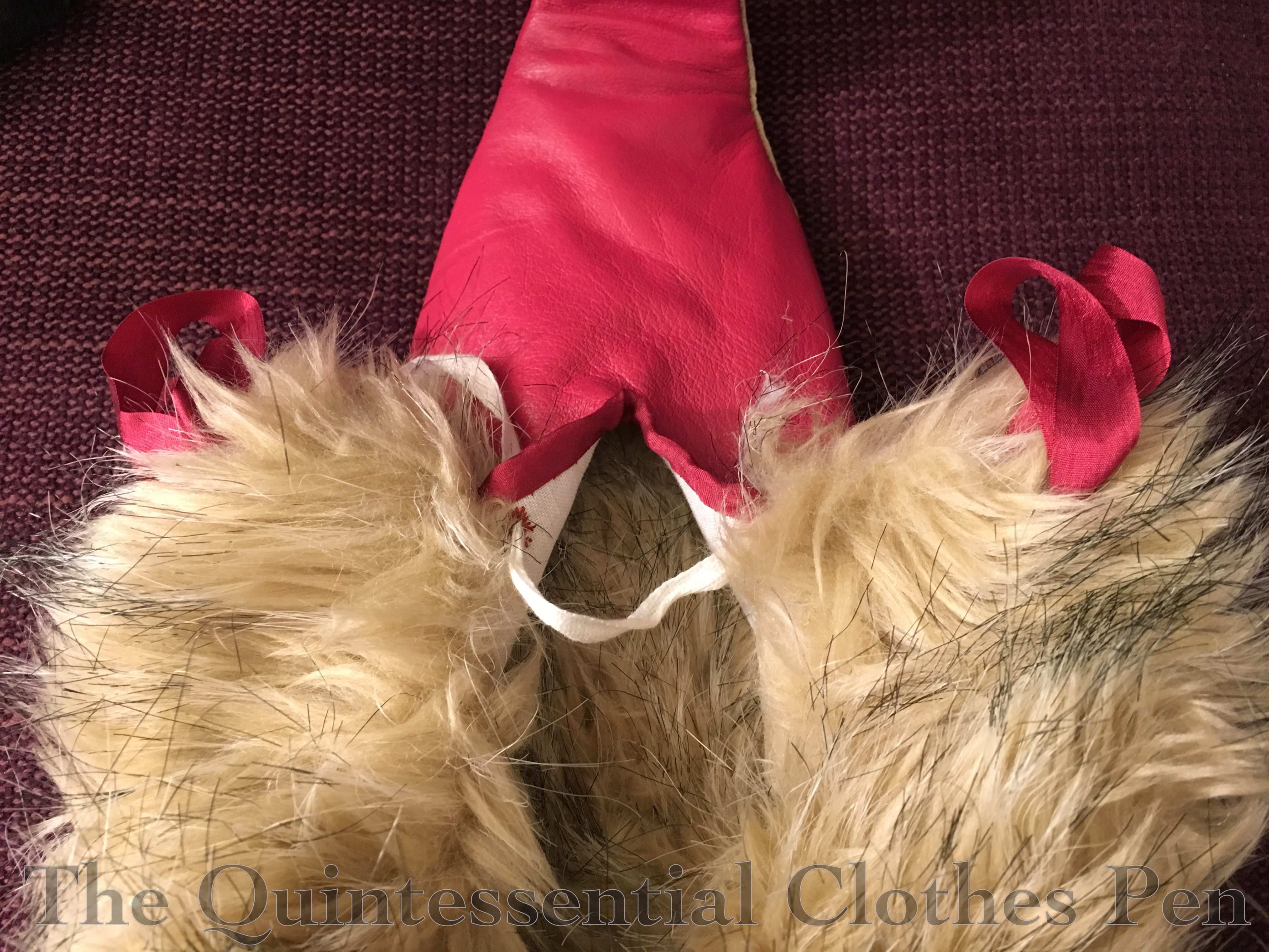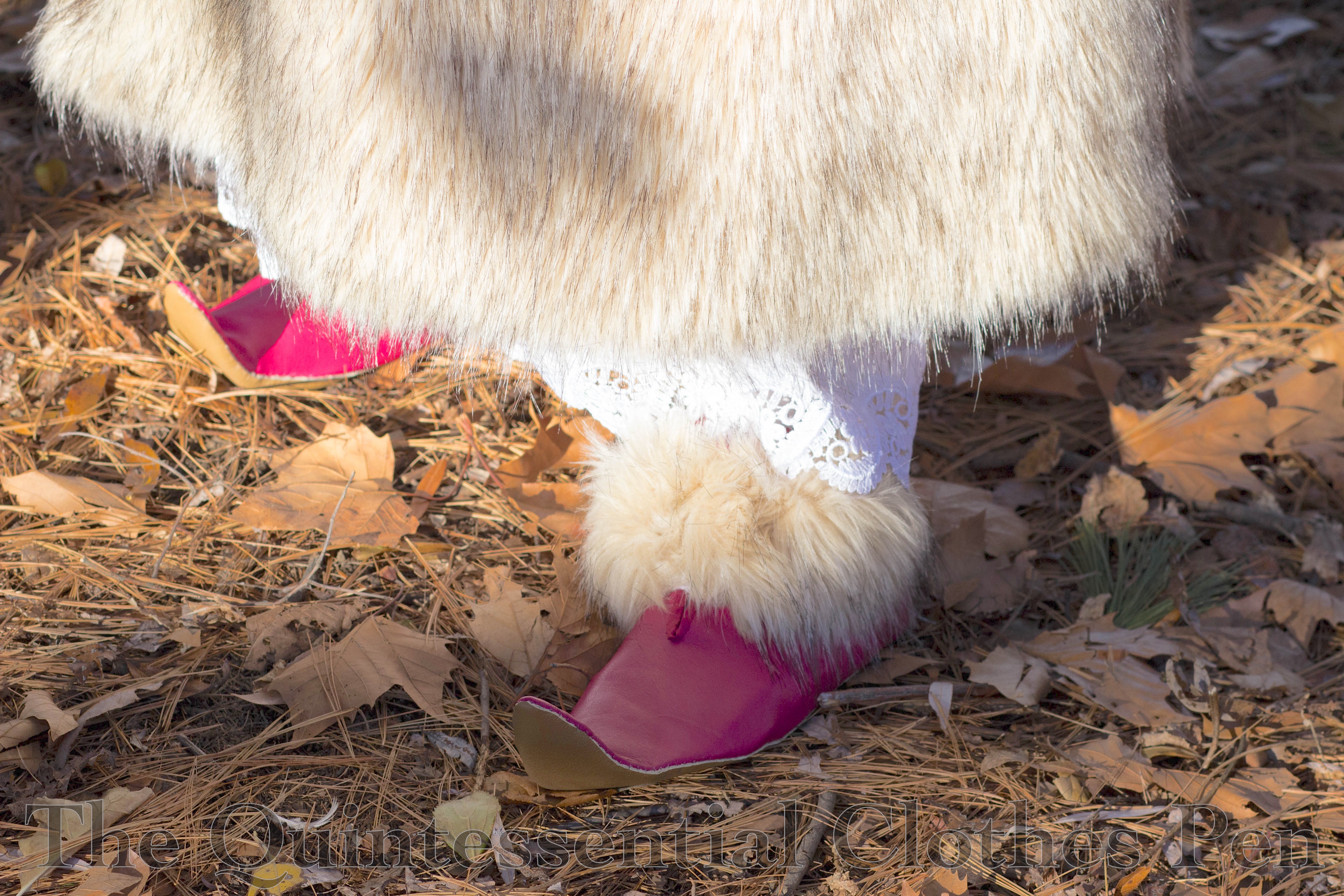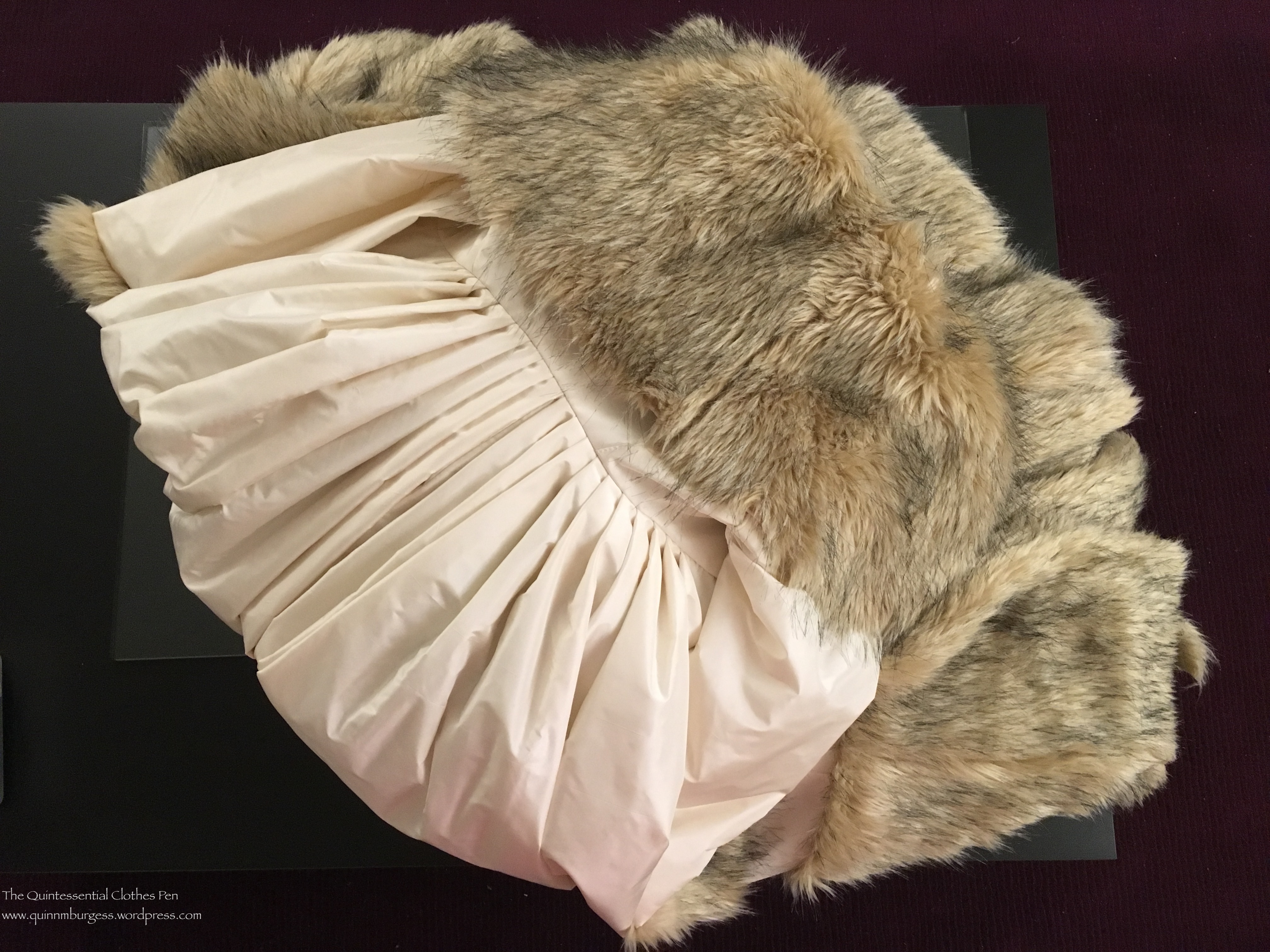 I’ve been saving the best for last–the construction of the main piece, the witzchoura itself. As with all the other pieces in this ensemble, the witzchoura is entirely hand sewn. It is made up of a faux fur lining and an exterior of silk taffeta flat lined with cotton flannel and trimmed with more faux fur. Here are some in progress photos.