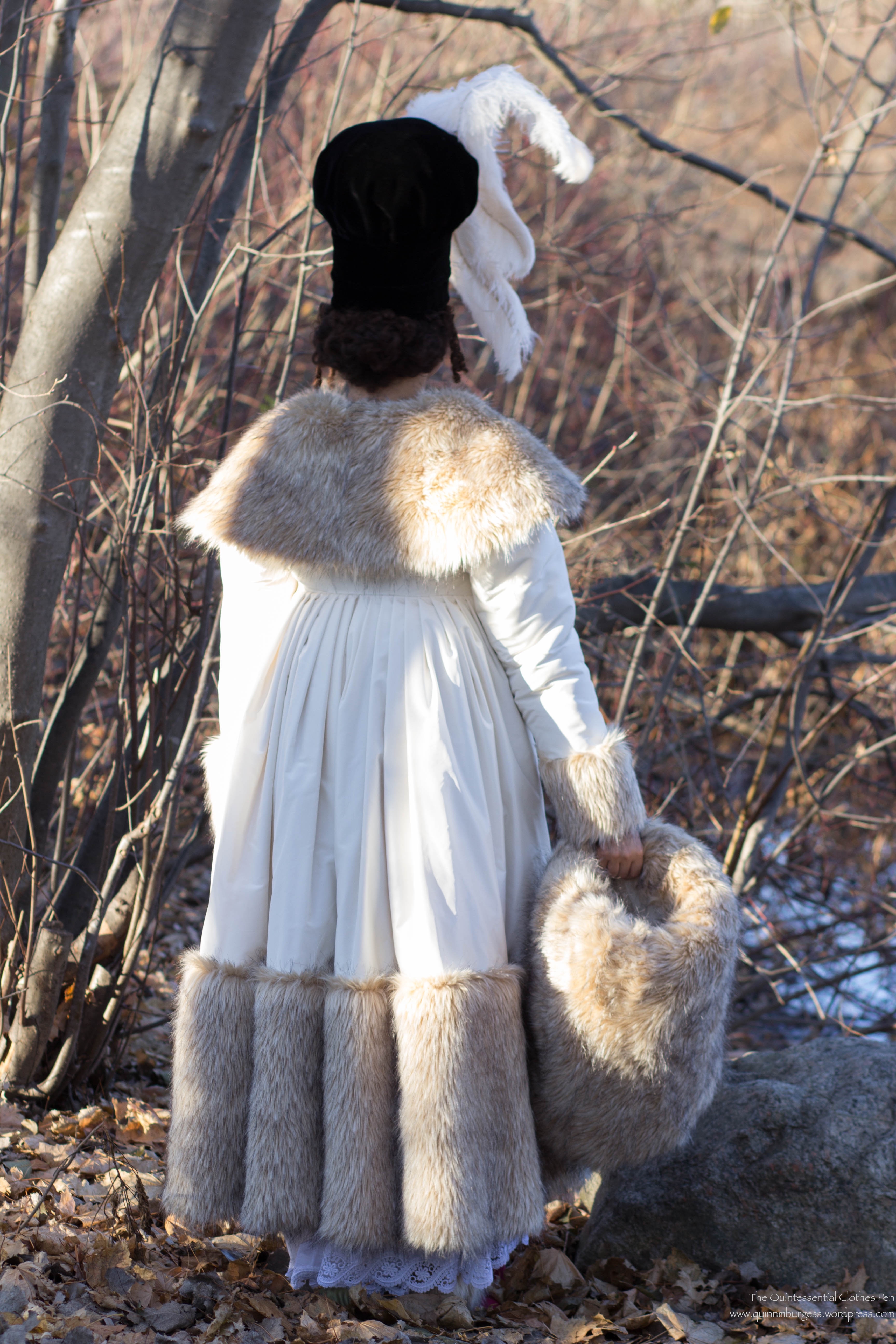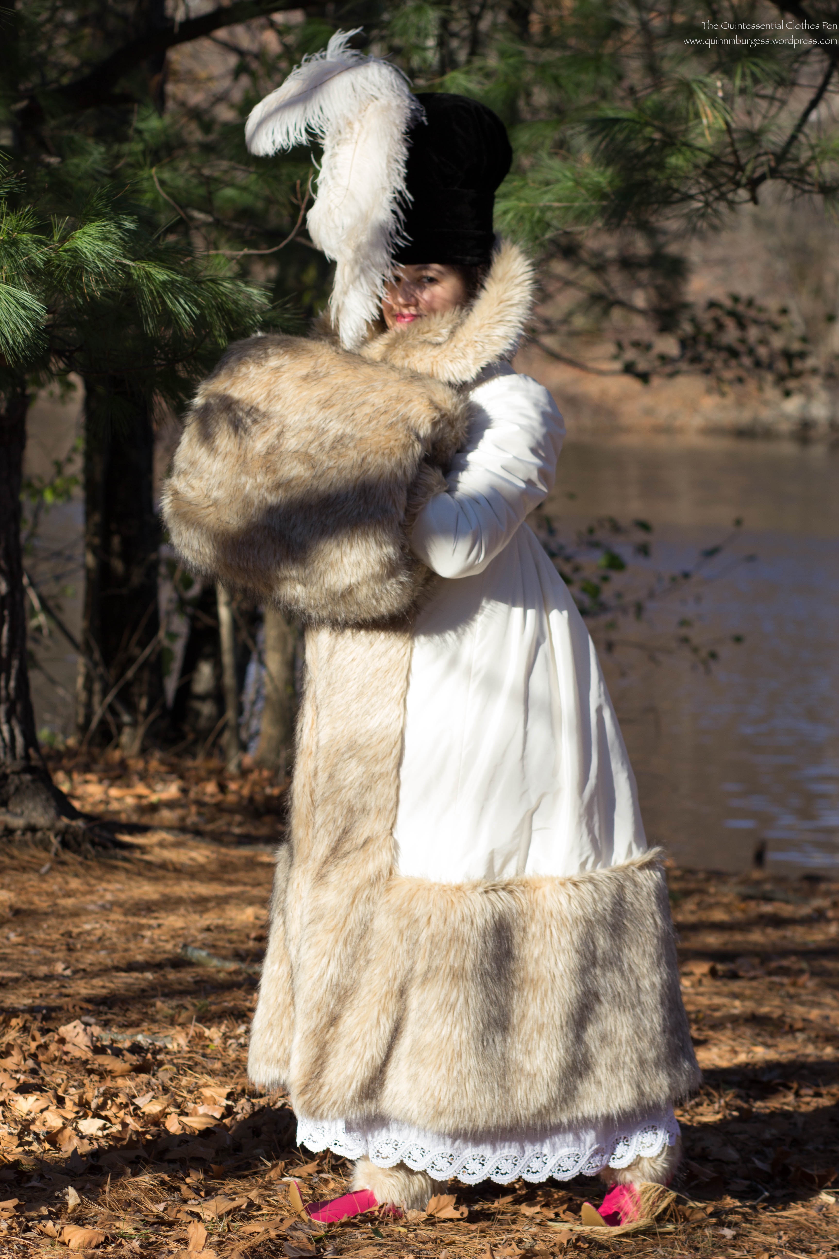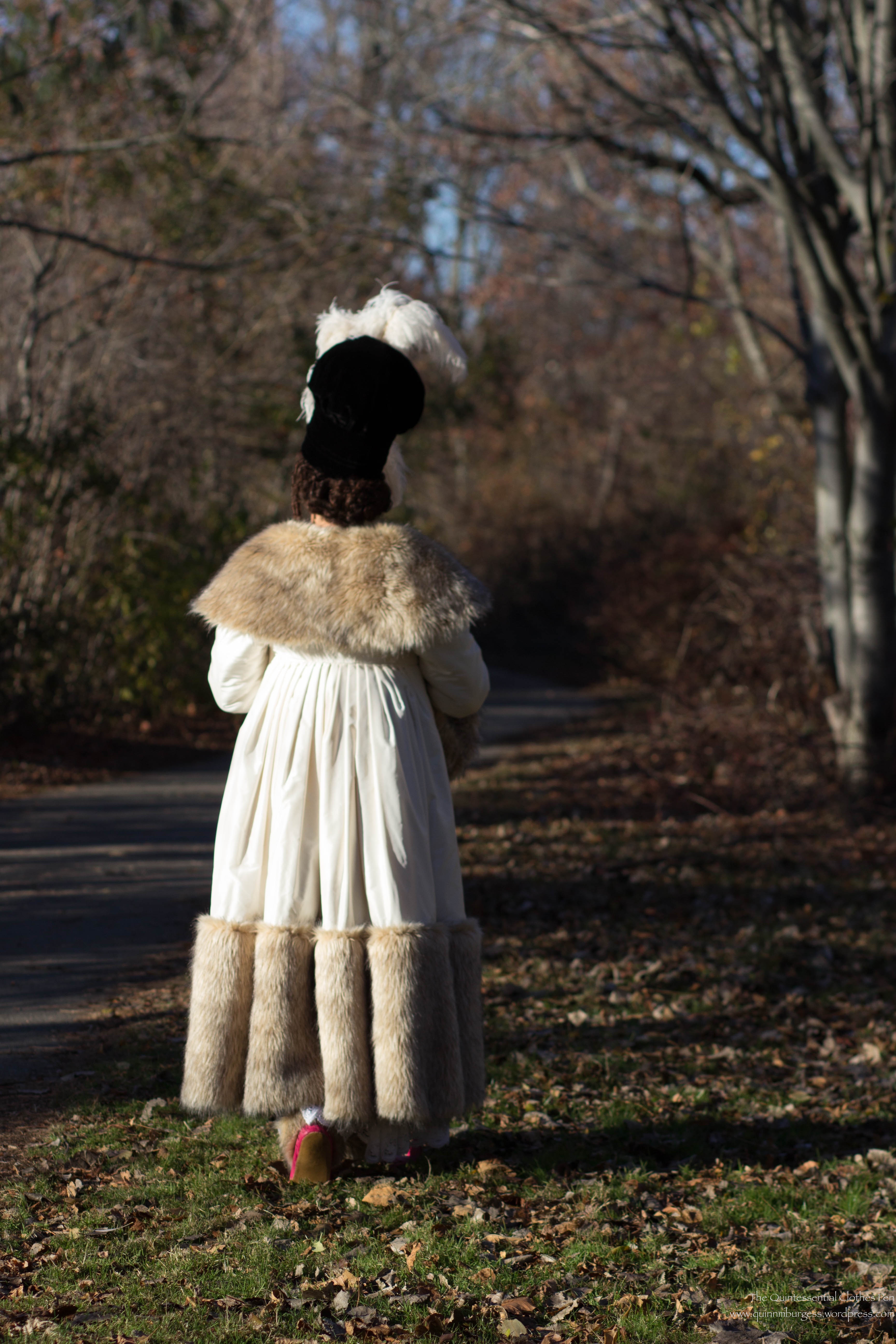 This is the sort of question I would want to know the answer to! Yes, it’s easy to walk. The ensemble does not restrict leg movement. I can also move my head with ease, because the hat sits low enough that it is well anchored and not going anywhere. However, the witzchoura does restrict arm movement some. For example, putting it on without just the right movement (which is lifting it up and behind and then sliding both arms in at the same time) doesn’t really work. And once it’s on, there’s only so much forward and backward arm movements that are possible. Lifting arms is better, but still not full range of movement. Each layer by itself has more possibilities, but the faux fur fills a lot of space inside the silk exterior. This makes it quite warm, but feels a little bit like wearing a marshmallow.