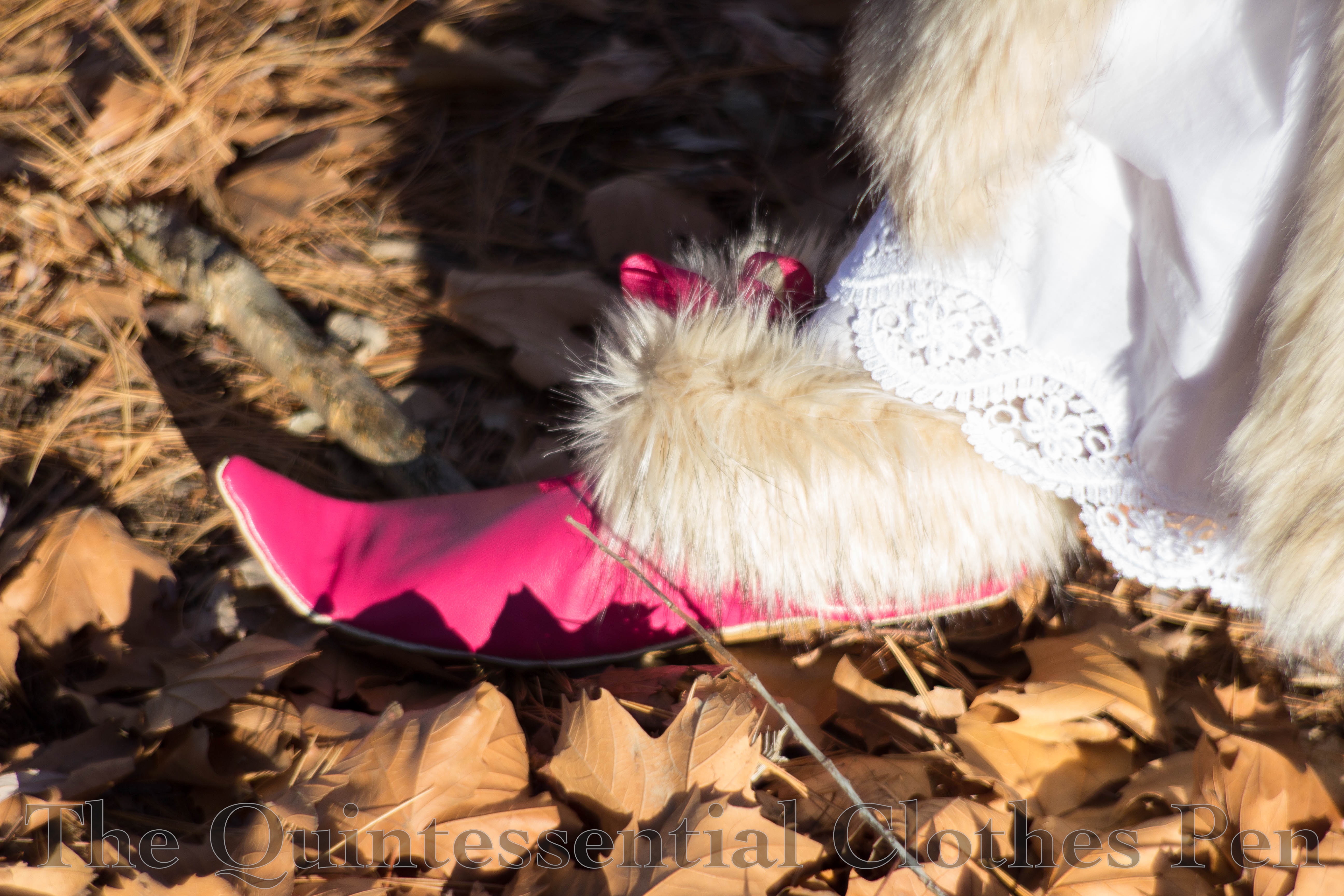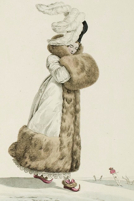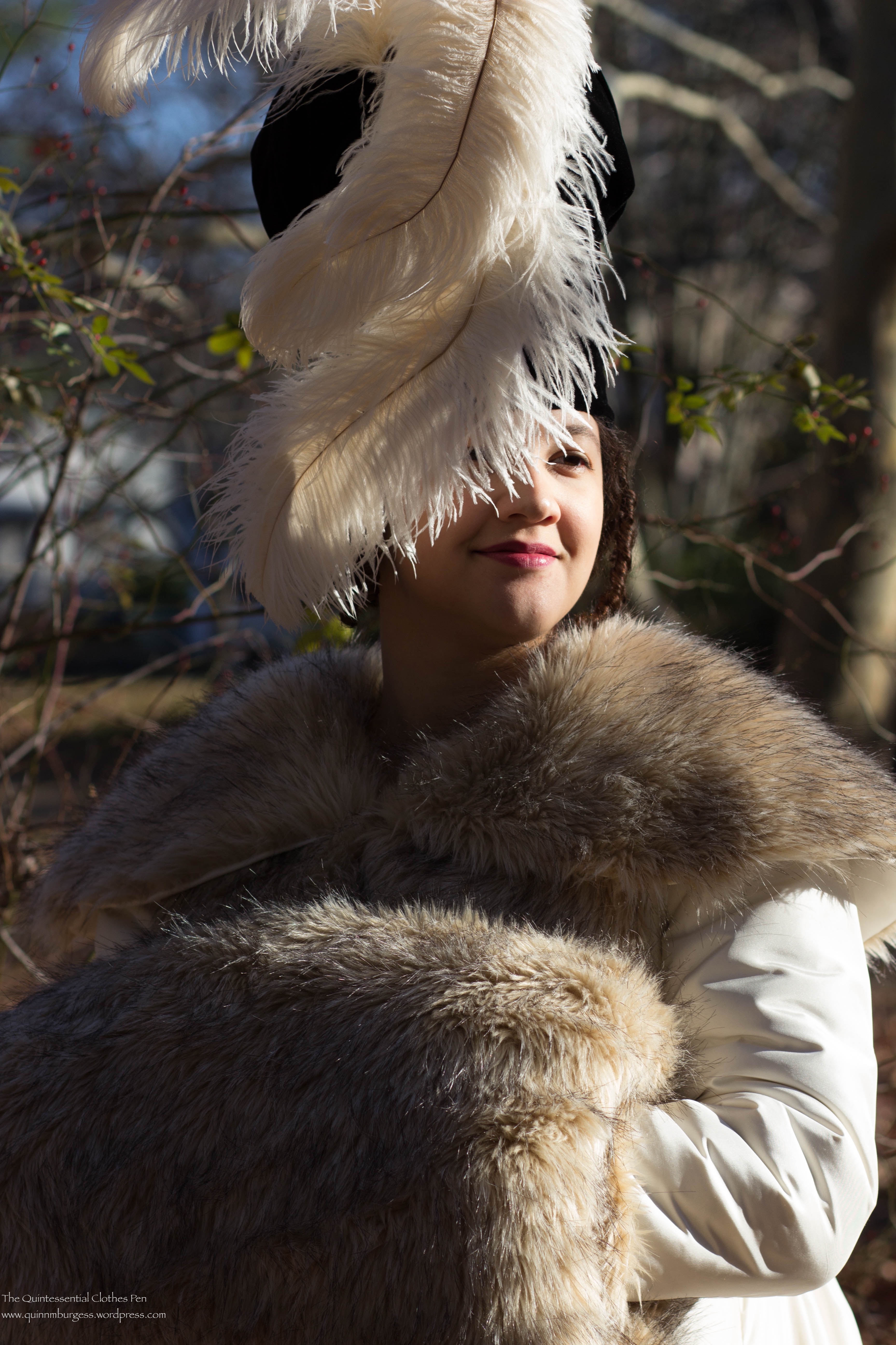 This is the sort of question I would want to know the answer to! Yes, it’s easy to walk. The ensemble does not restrict leg movement. I can also move my head with ease, because the hat sits low enough that it is well anchored and not going anywhere. However, the witzchoura does restrict arm movement some. For example, putting it on without just the right movement (which is lifting it up and behind and then sliding both arms in at the same time) doesn’t really work. And once it’s on, there’s only so much forward and backward arm movements that are possible. Lifting arms is better, but still not full range of movement. Each layer by itself has more possibilities, but the faux fur fills a lot of space inside the silk exterior. This makes it quite warm, but feels a little bit like wearing a marshmallow.