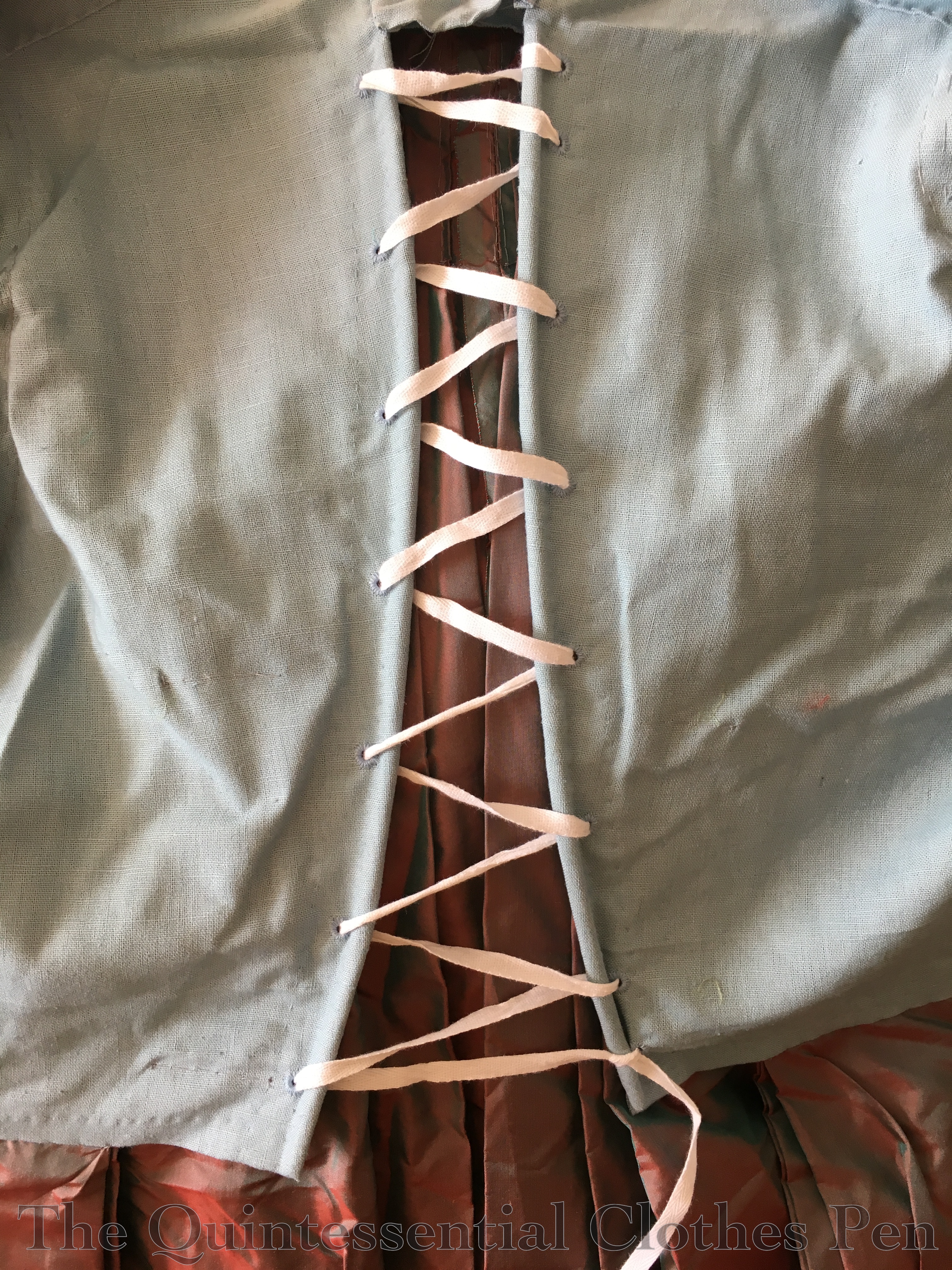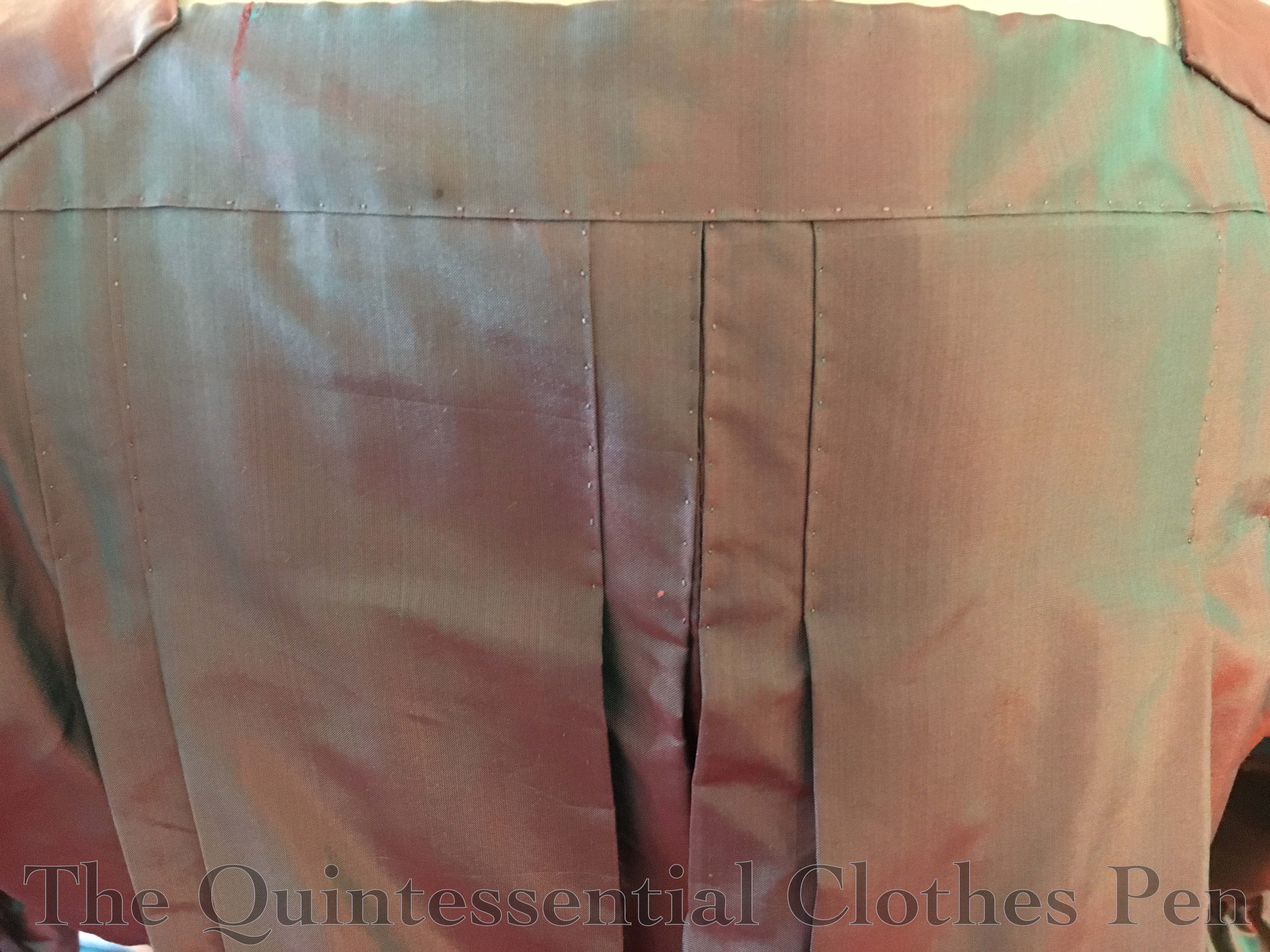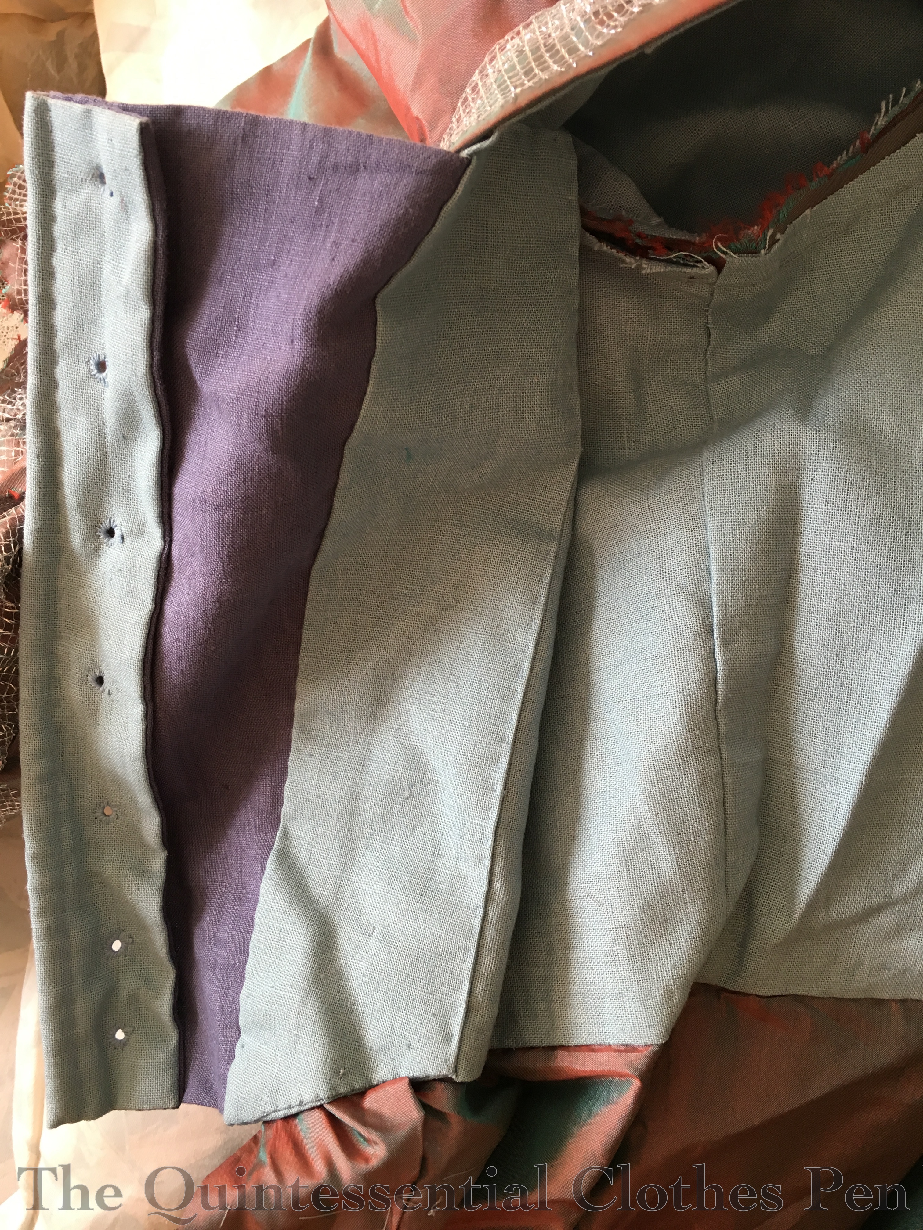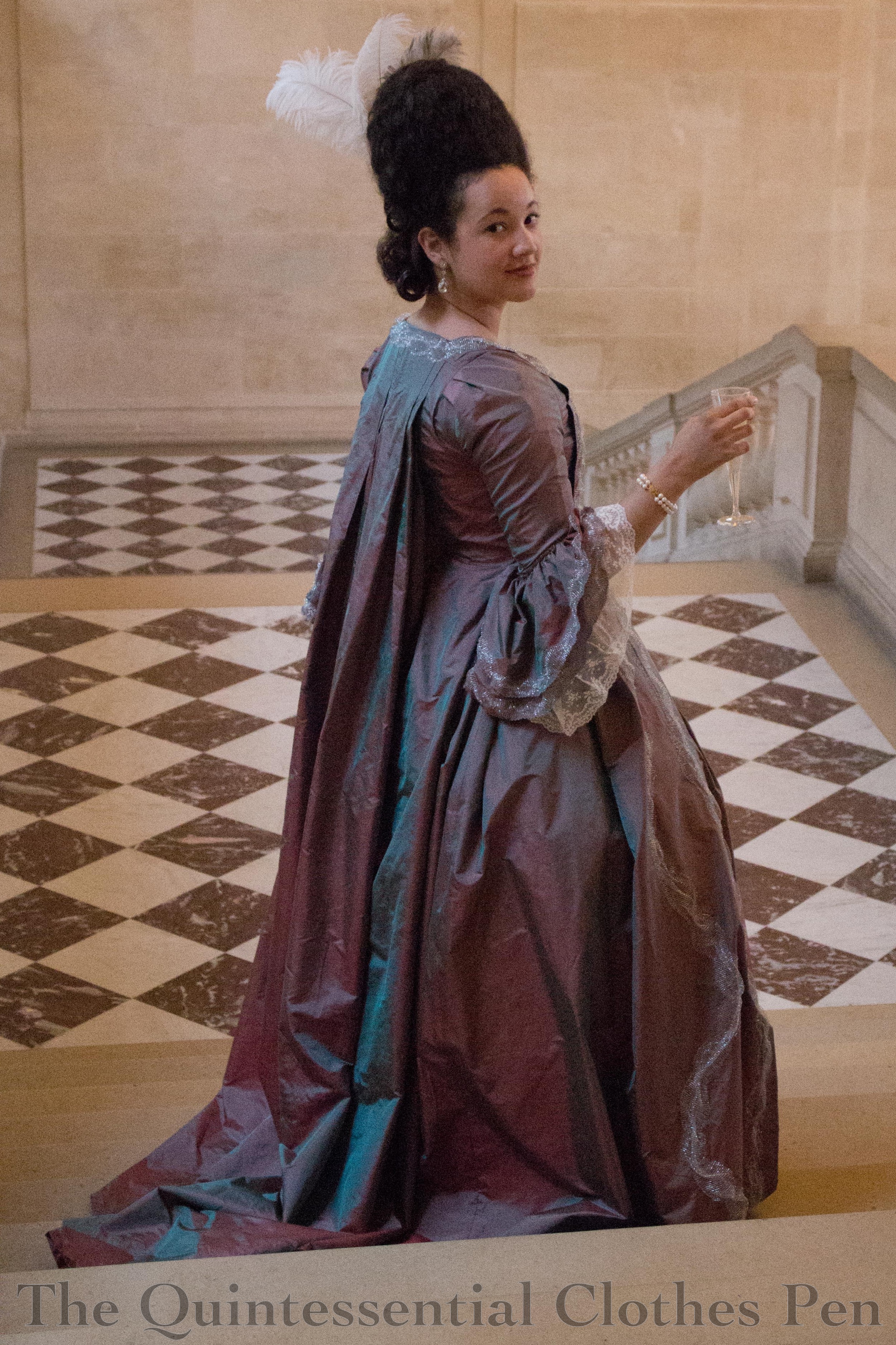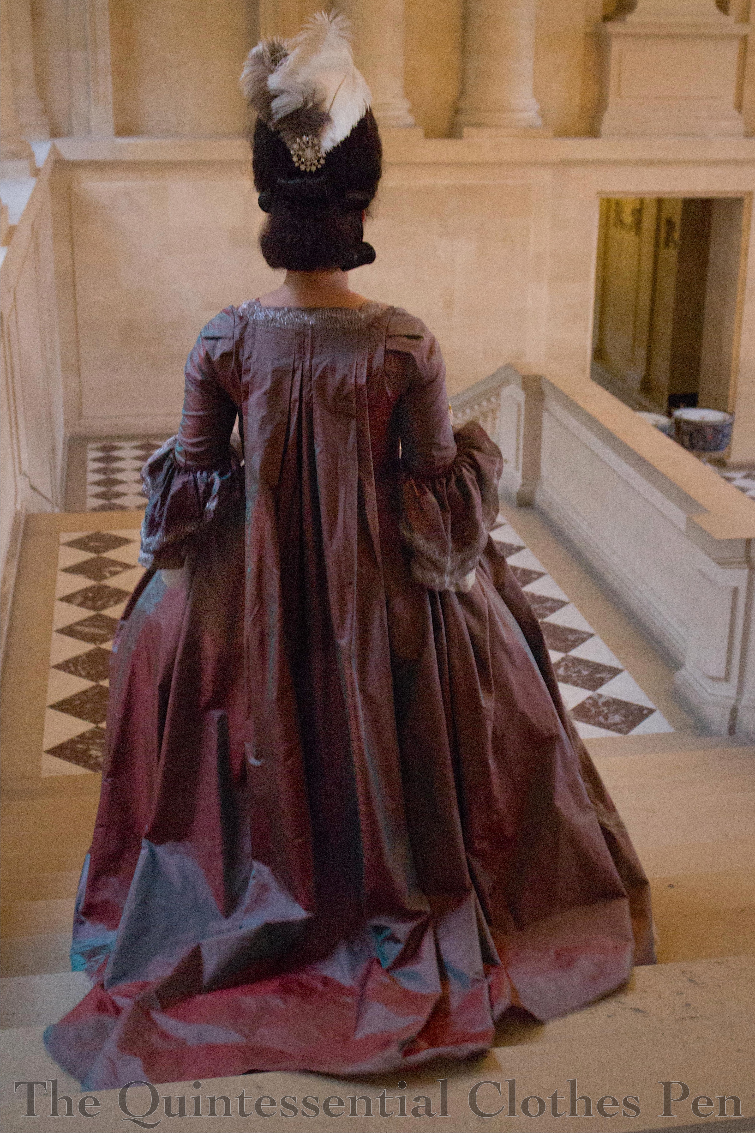 One of the things that I’d struggled to capture in photos for the Versailles dress’s first wearing was the changeable nature of the silk fabric. It is a ‘shot’ fabric, meaning that it uses two different colors woven in opposite directions: a vibrant turquoise and a deep red. This means that fabric appears to be both colors, or a mixture that looks a bit purple, depending on how the light hits it.