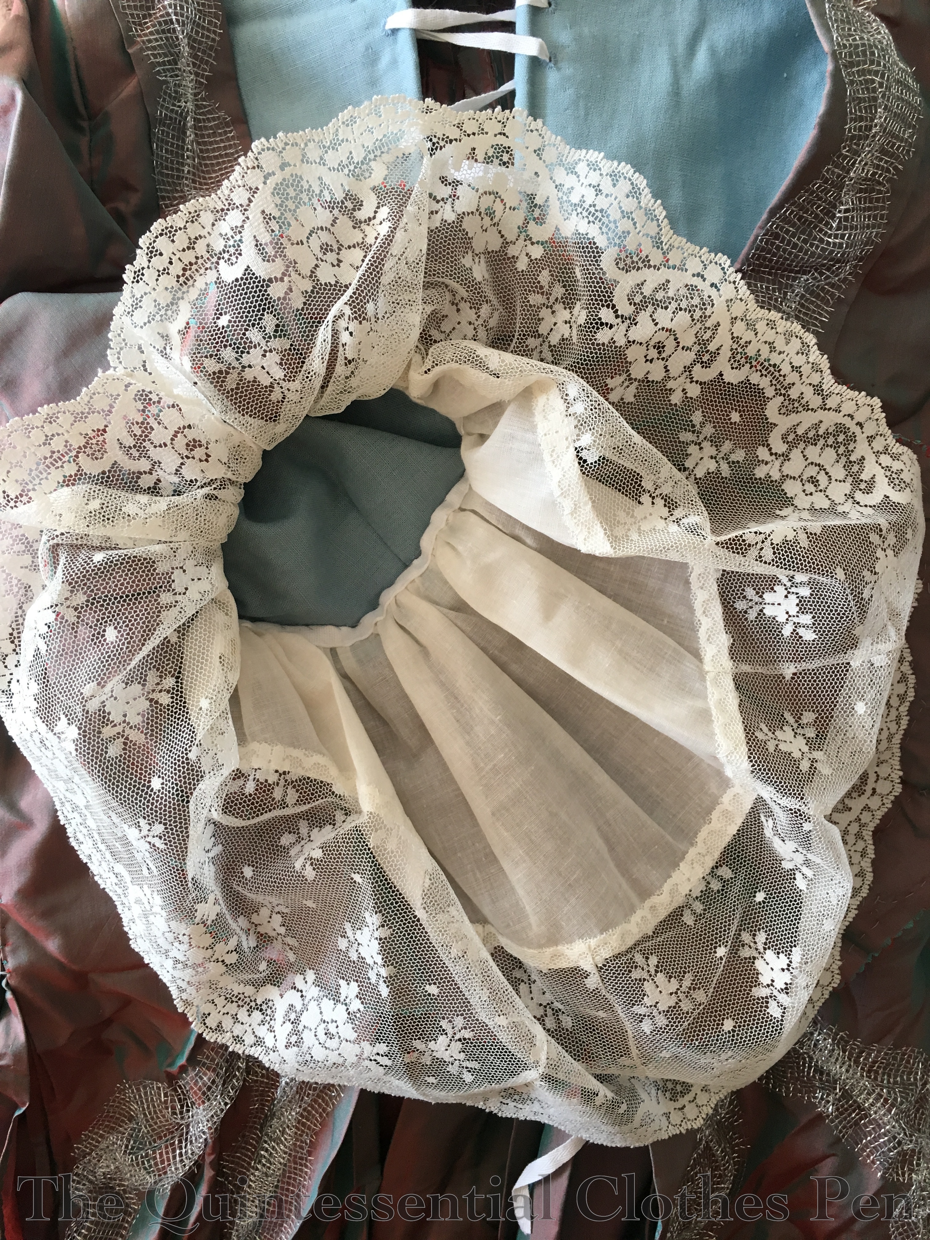 For the formal evening part of the event, I chose to wear my Versailles Sacque (made and last worn in 2016, which I posted about here)! For this wearing, I updated the ensemble with a lace tucker around the neckline of the dress. This small new accessory helps complete the full look. It took a little bit of referencing my old blog posts to reconstruct my hair form and remind myself what accessories to wear, but I was successful. I was very grateful to myself for documenting things so well!