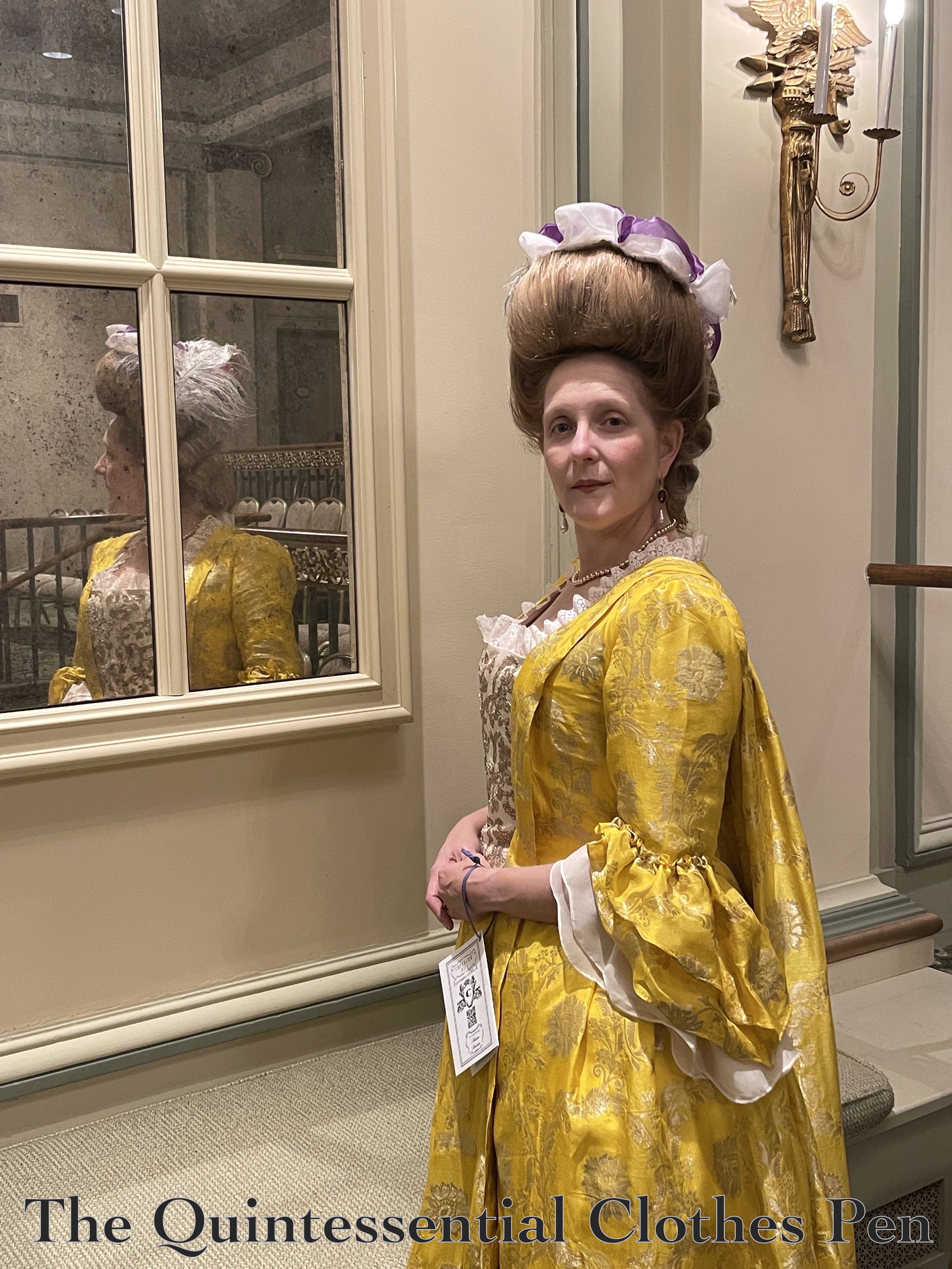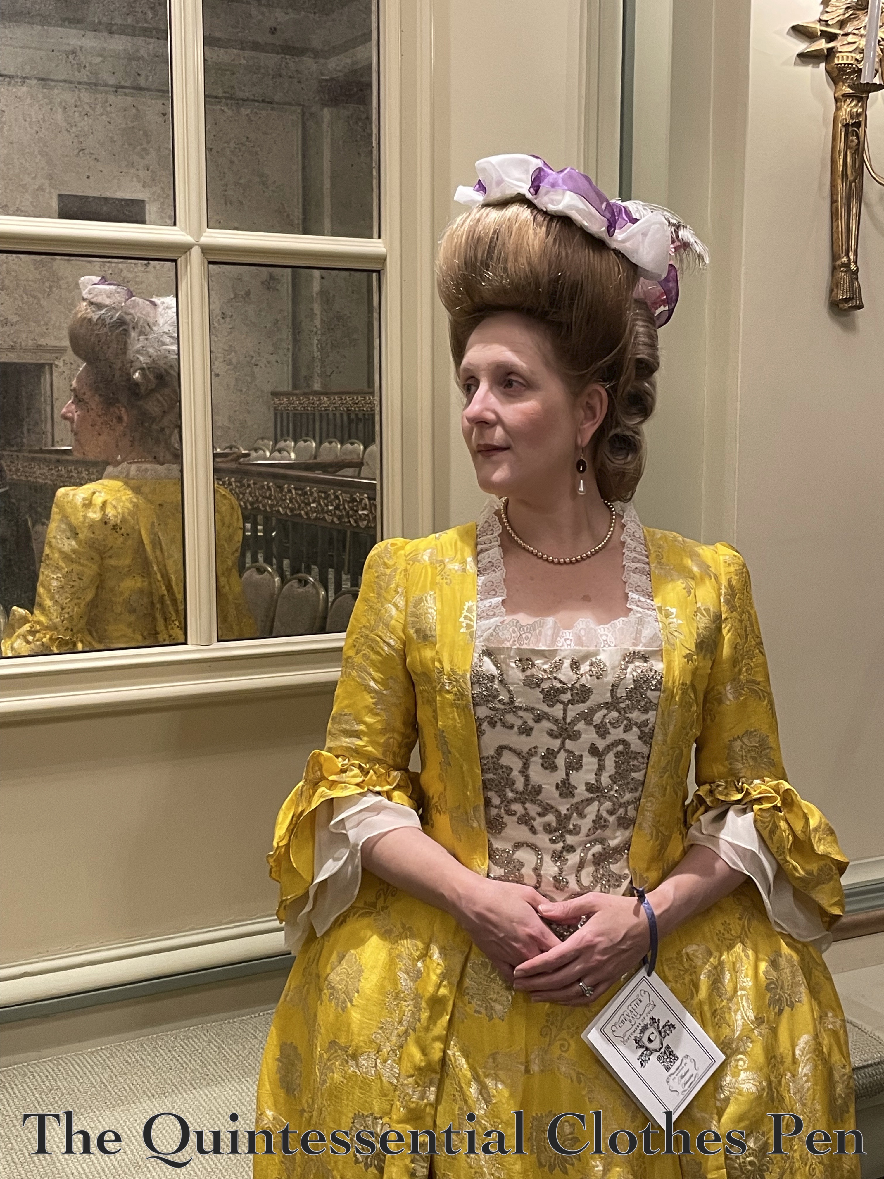 I am finally ready to share a full set of photos of the new Yellow Sacque and its friend, my older Versailles sacque (all of the construction details for these dresses can be found by clicking the links)! The two dresses had a joyful outing together at an event last year. This post is going to share about the event itself as well as photos and recollections.